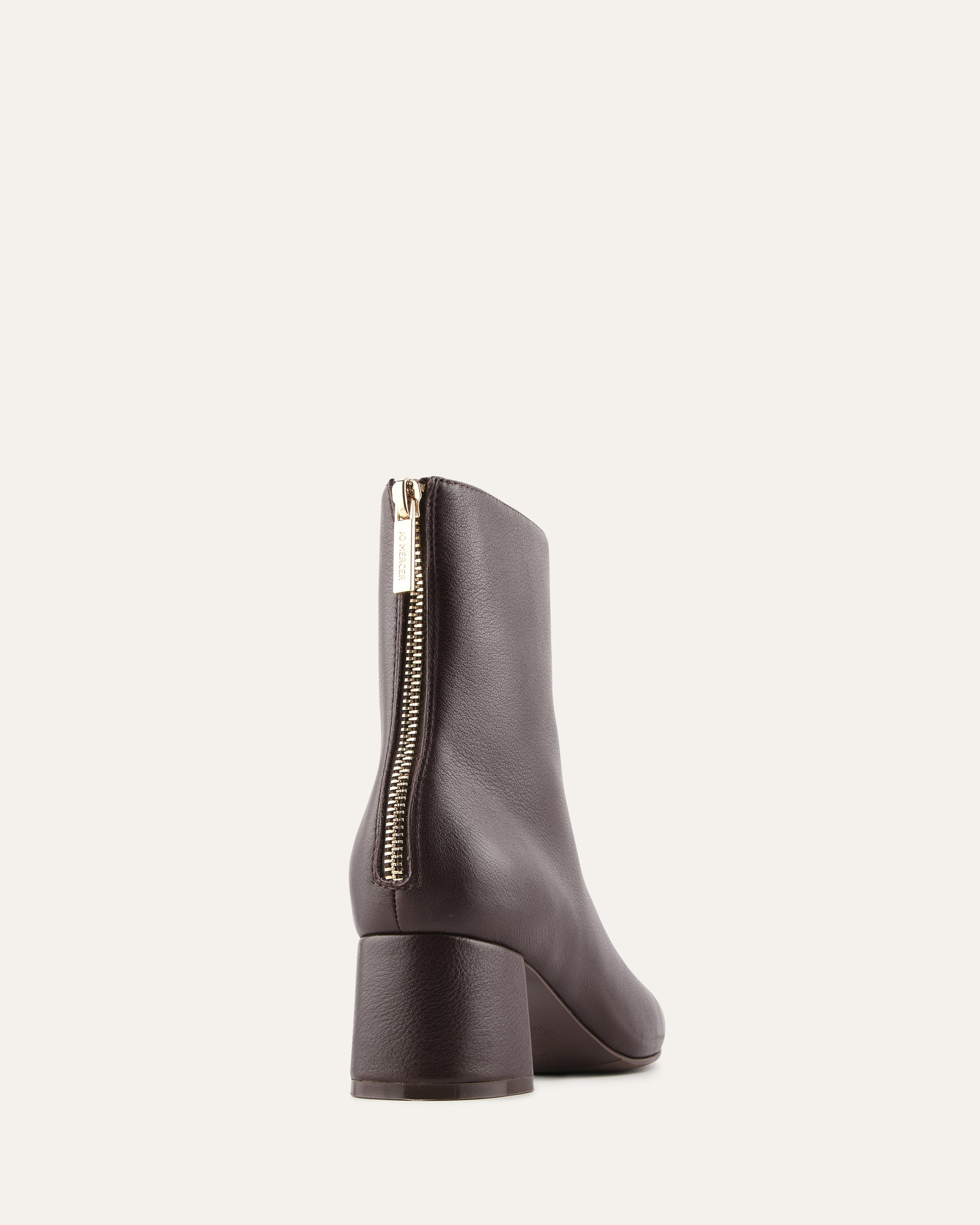 Find your next boot in NORI. This sleek ankle boot is crafted from soft-tumbled cow leather and features a fine centre stitch detailing and finished with a gunmetal back zip closure. The low flared block heel is perfect from the transition from day to night.