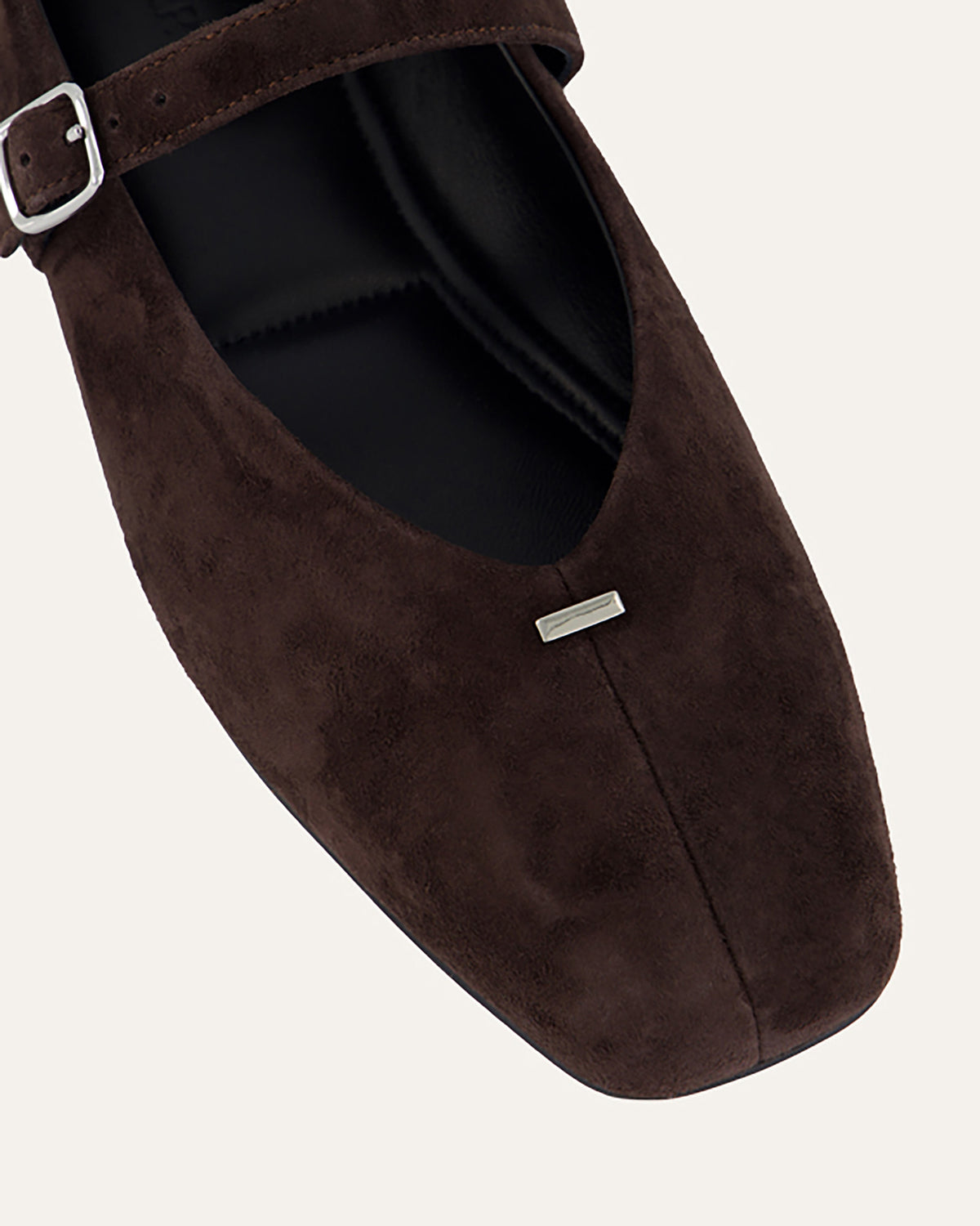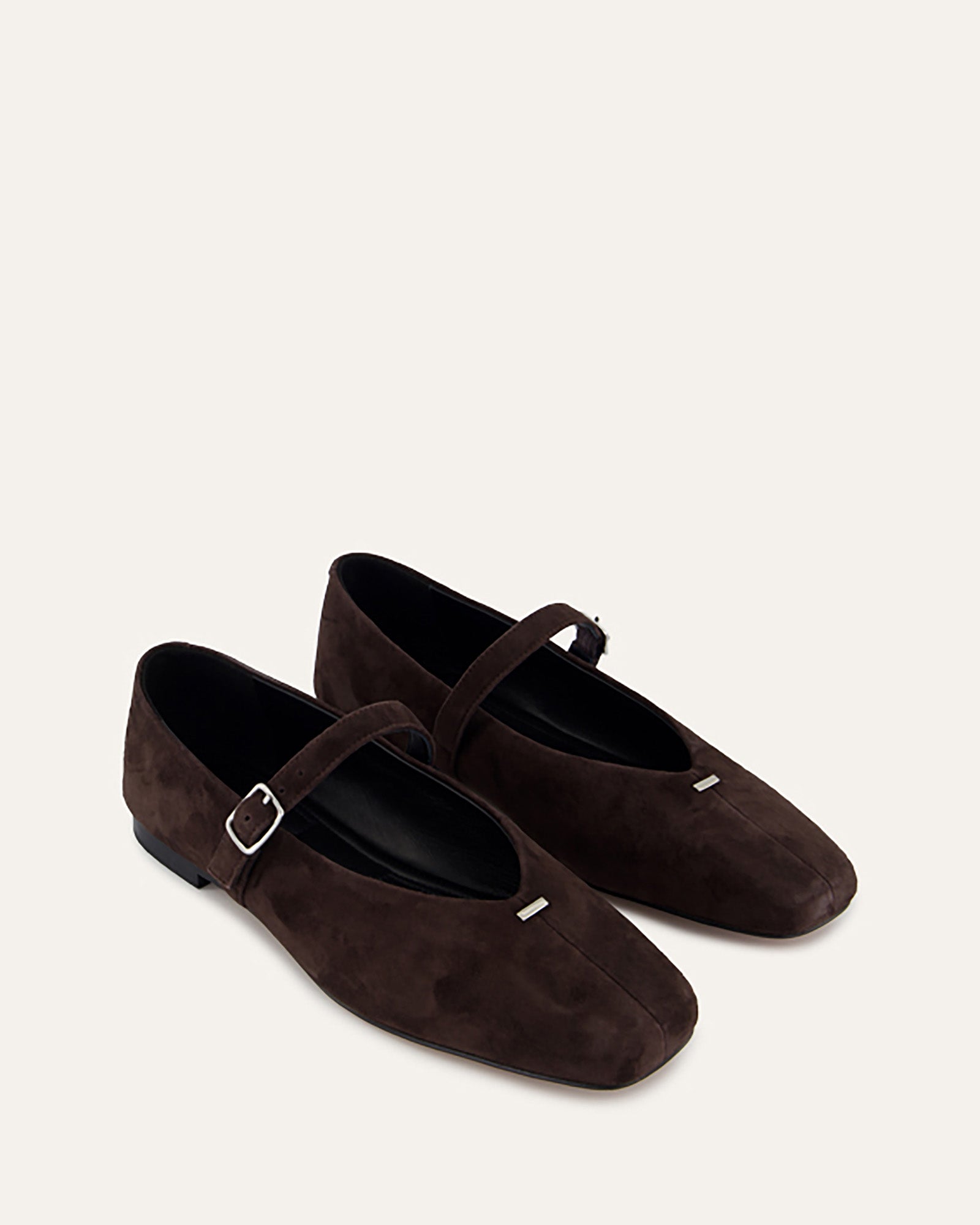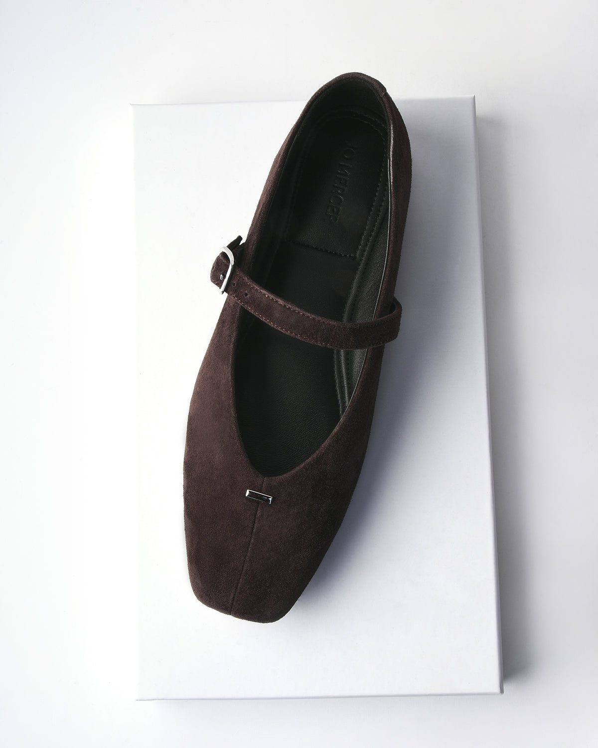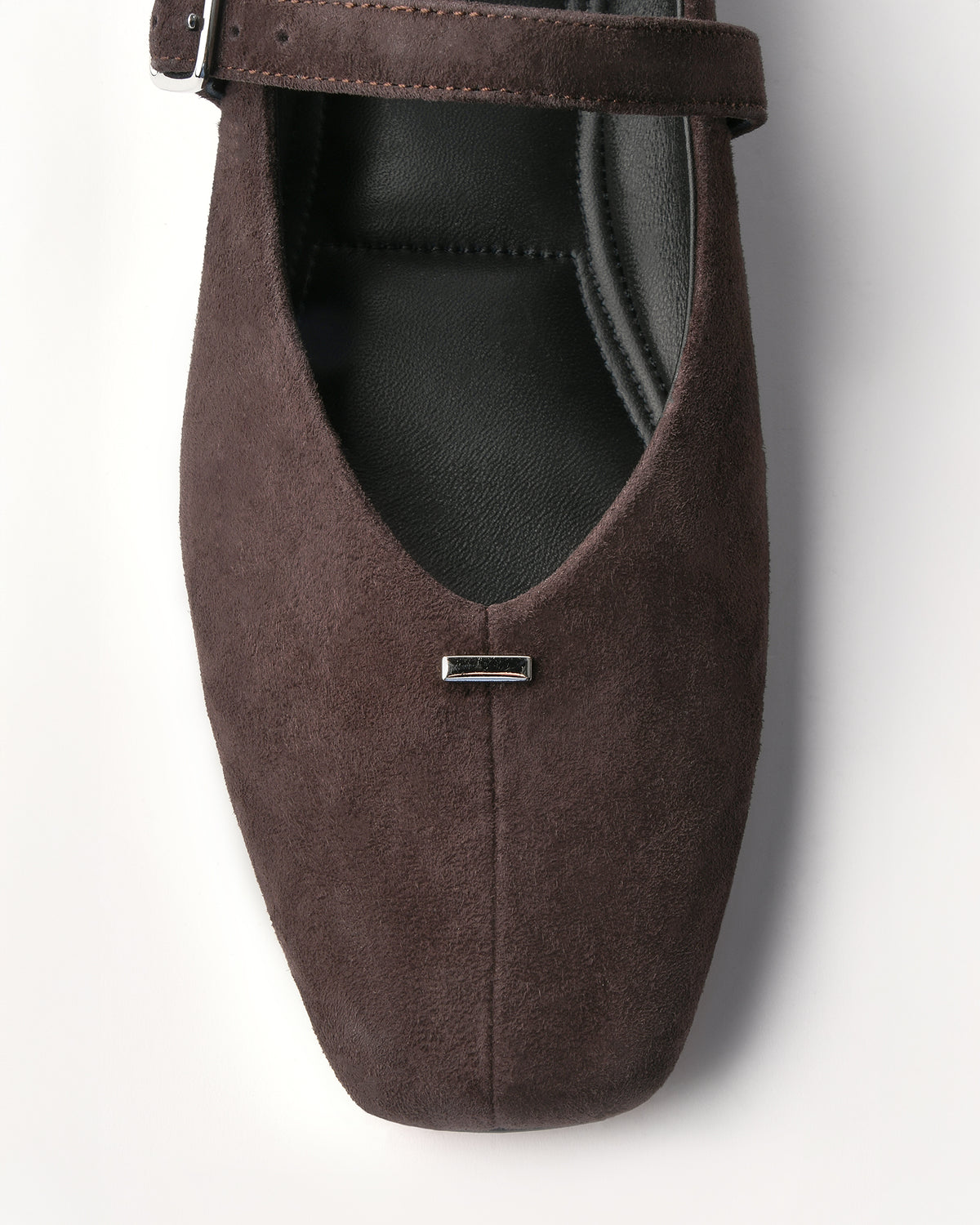 Ballet flats are trending this season with an understated yet distinct silhouette. APRIL features a luxe suede upper and buckle with shiny silver metallic toned hardware rested on a 12mm leather stacked heel and resin sole. The chic softly squared toe shape, v shape topline, quilted memory foam insole padding and shiny silver metal vamp trim, makes APRIL stand out from the rest. Keep the subtle details in focus with cropped hems.