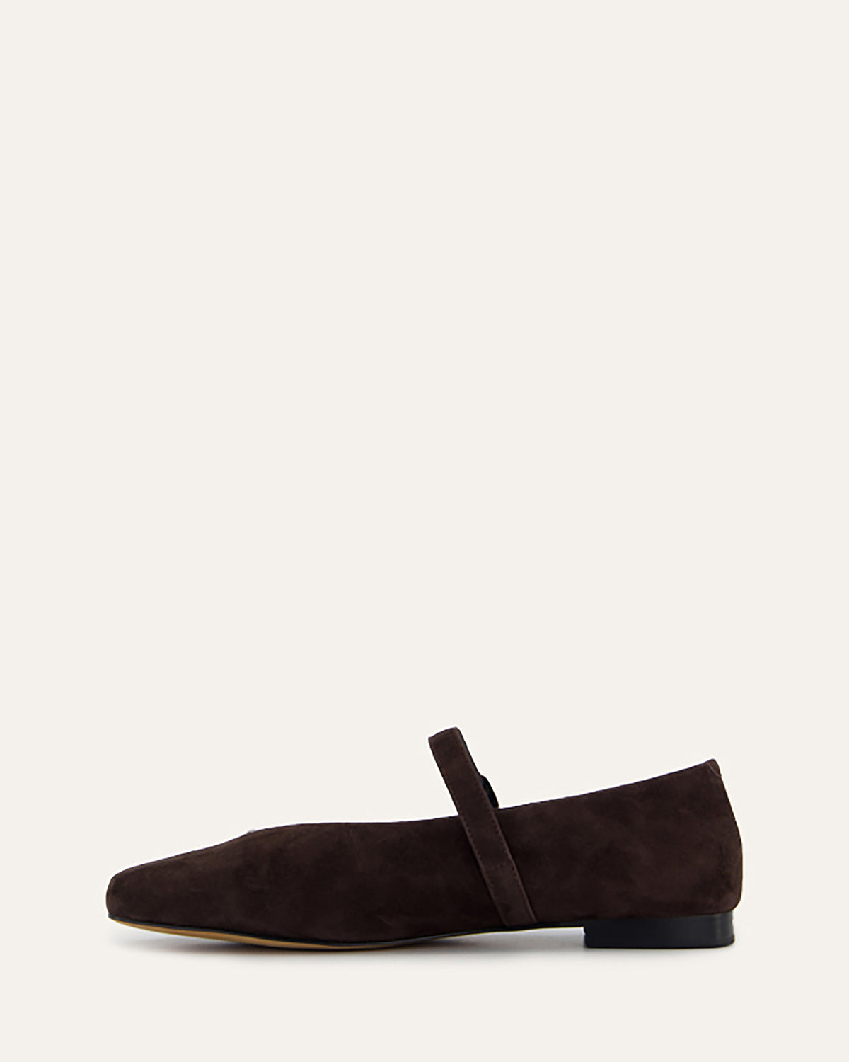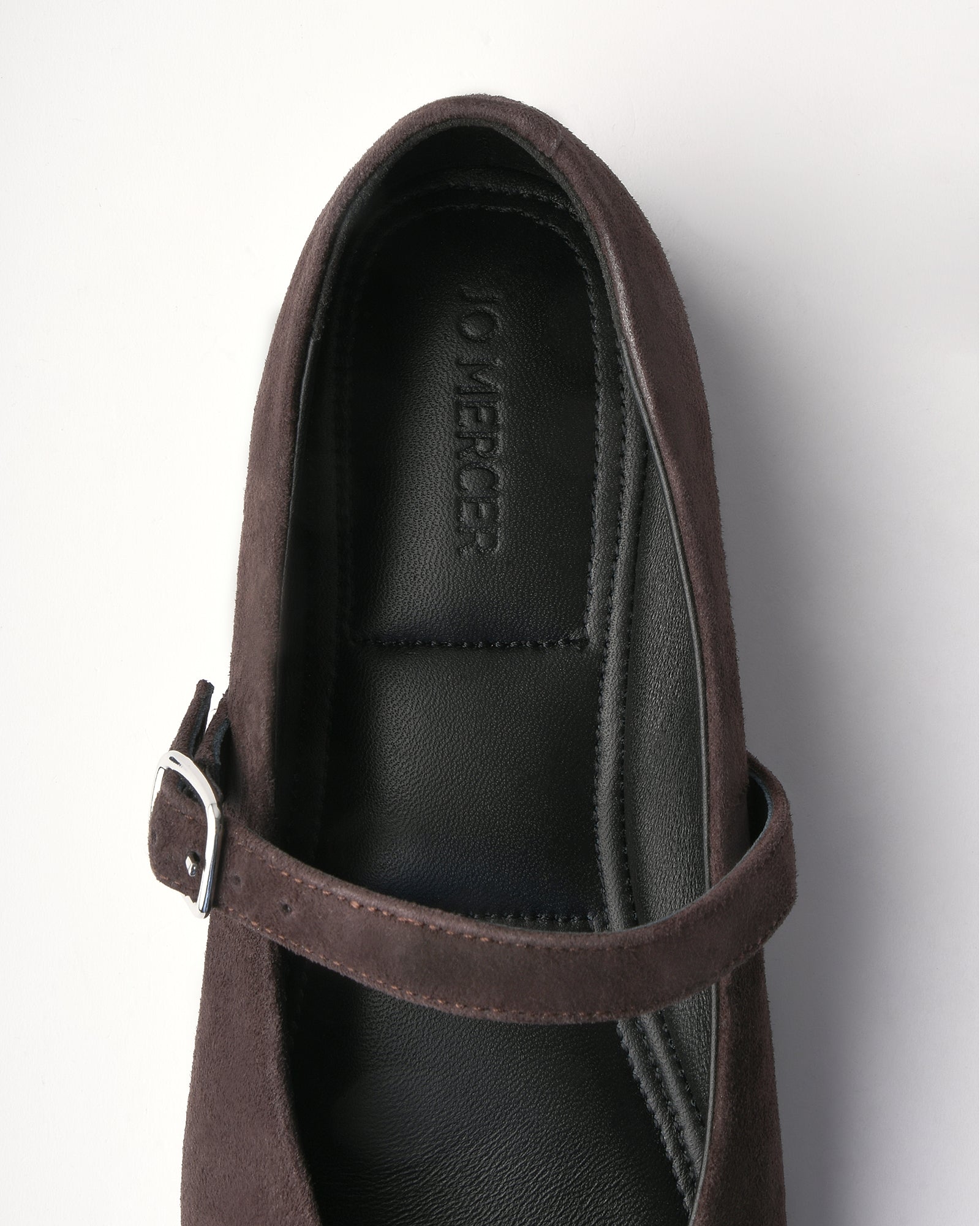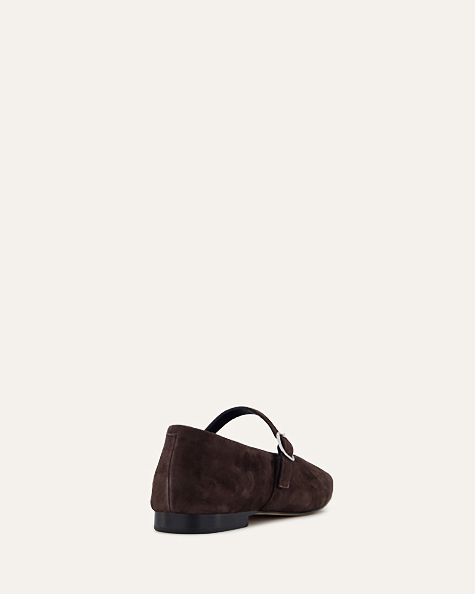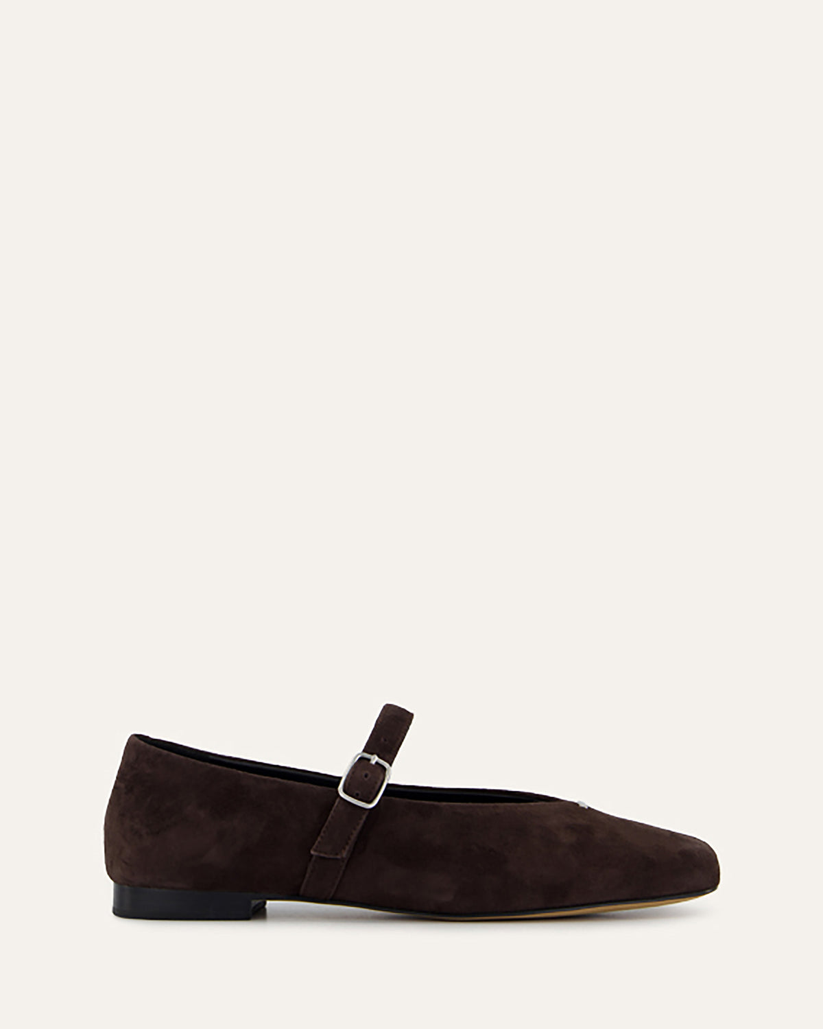 Ballet flats are trending this season with an understated yet distinct silhouette. APRIL features a luxe suede upper and buckle with shiny silver metallic toned hardware rested on a 12mm leather stacked heel and resin sole. The chic softly squared toe shape, v shape topline, quilted memory foam insole padding and shiny silver metal vamp trim, makes APRIL stand out from the rest. Keep the subtle details in focus with cropped hems.