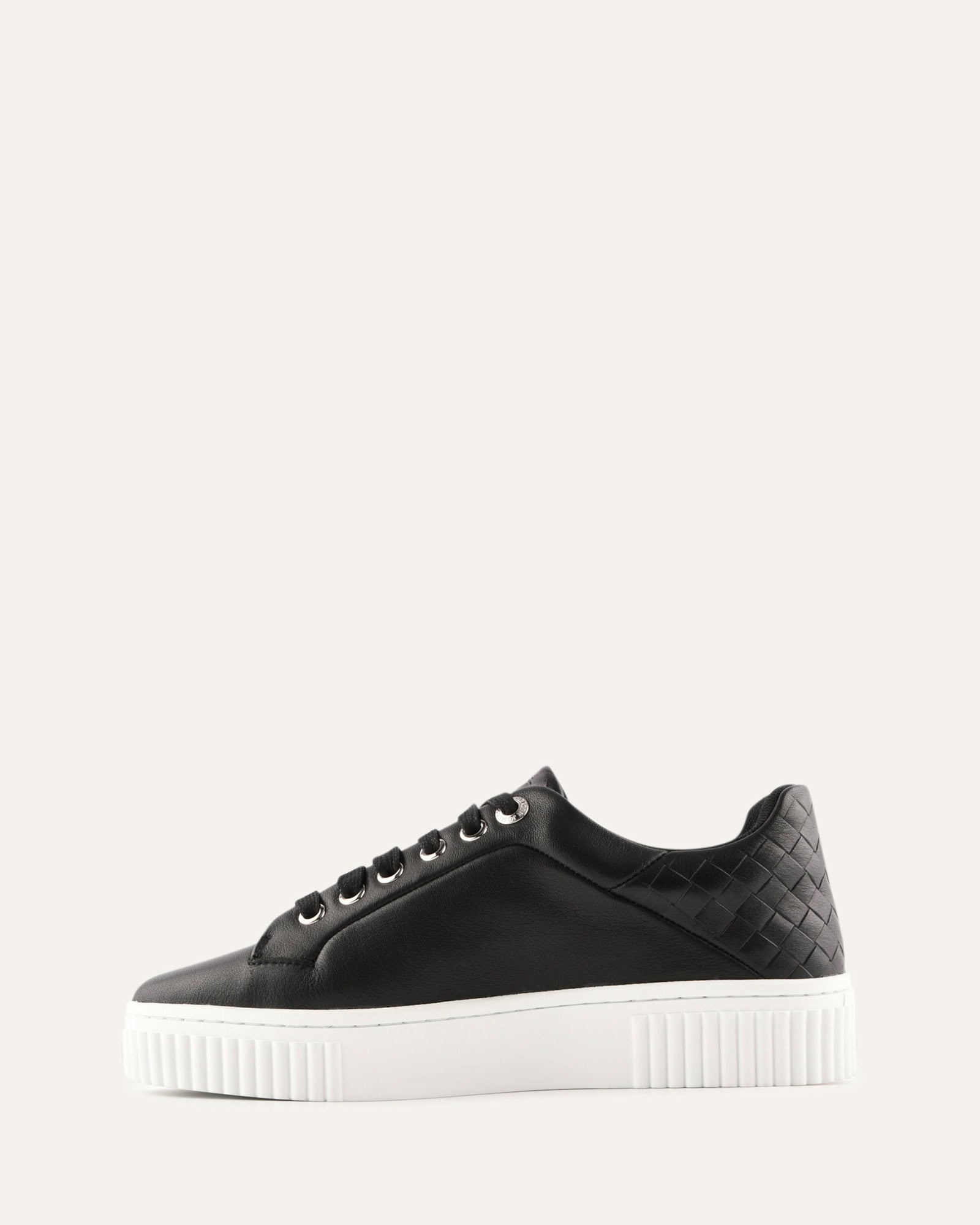 CAMPBELL is crafted from a soft kid leather upper, with a white rubber sole and woven embossed pattern heel. The chunky-style sole supports everyday wear and is finished with silver eyelets and subtle Jo Mercer branding.