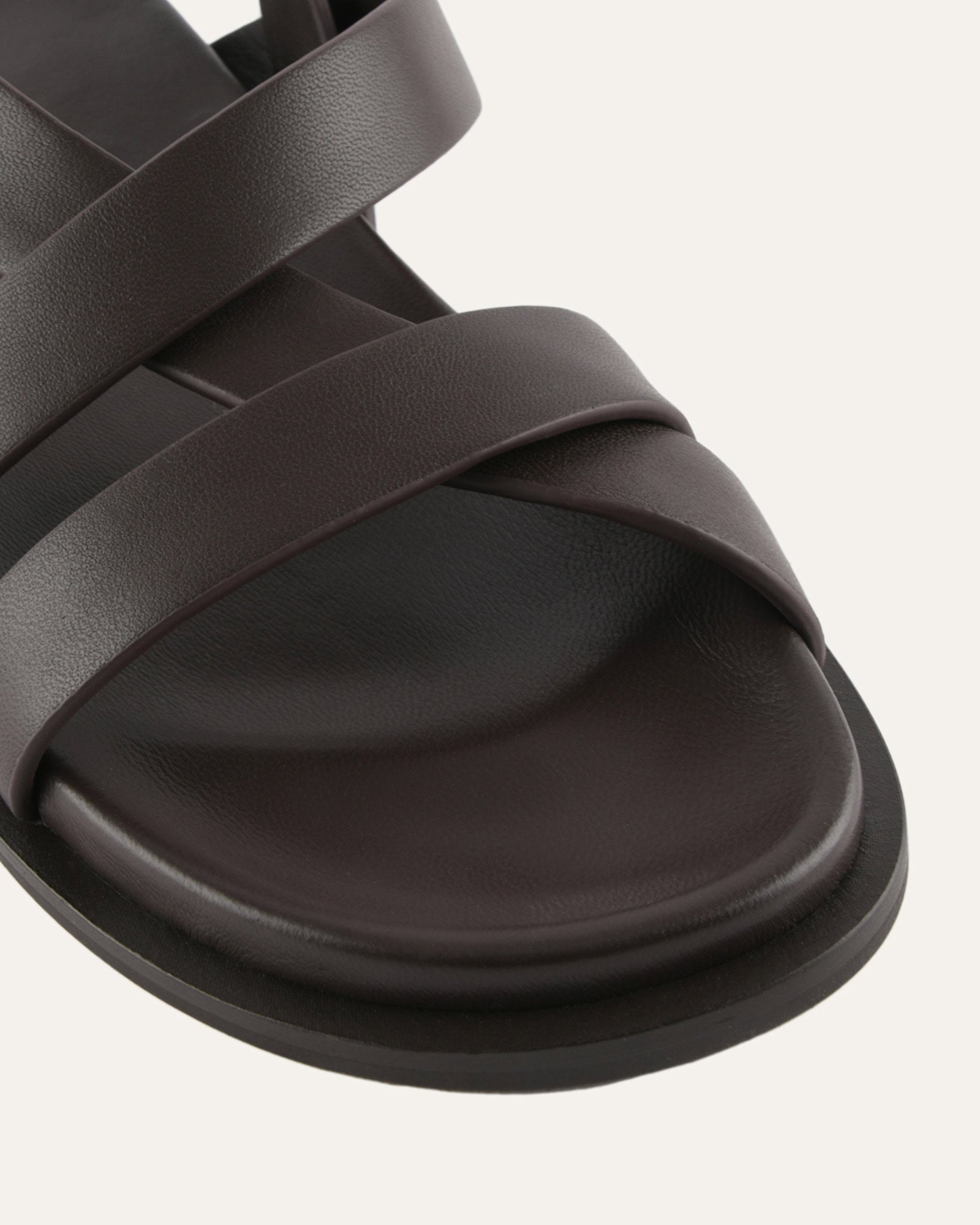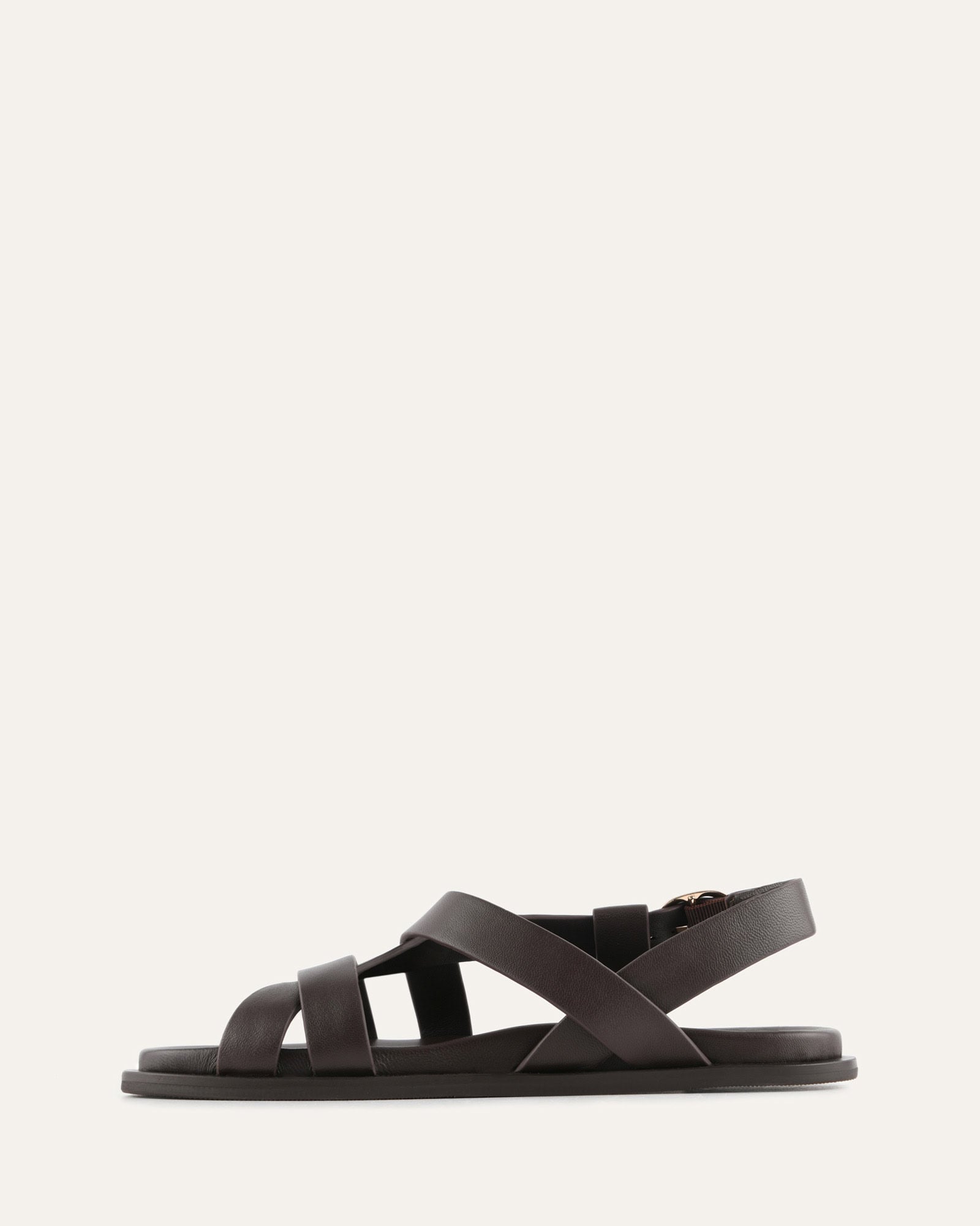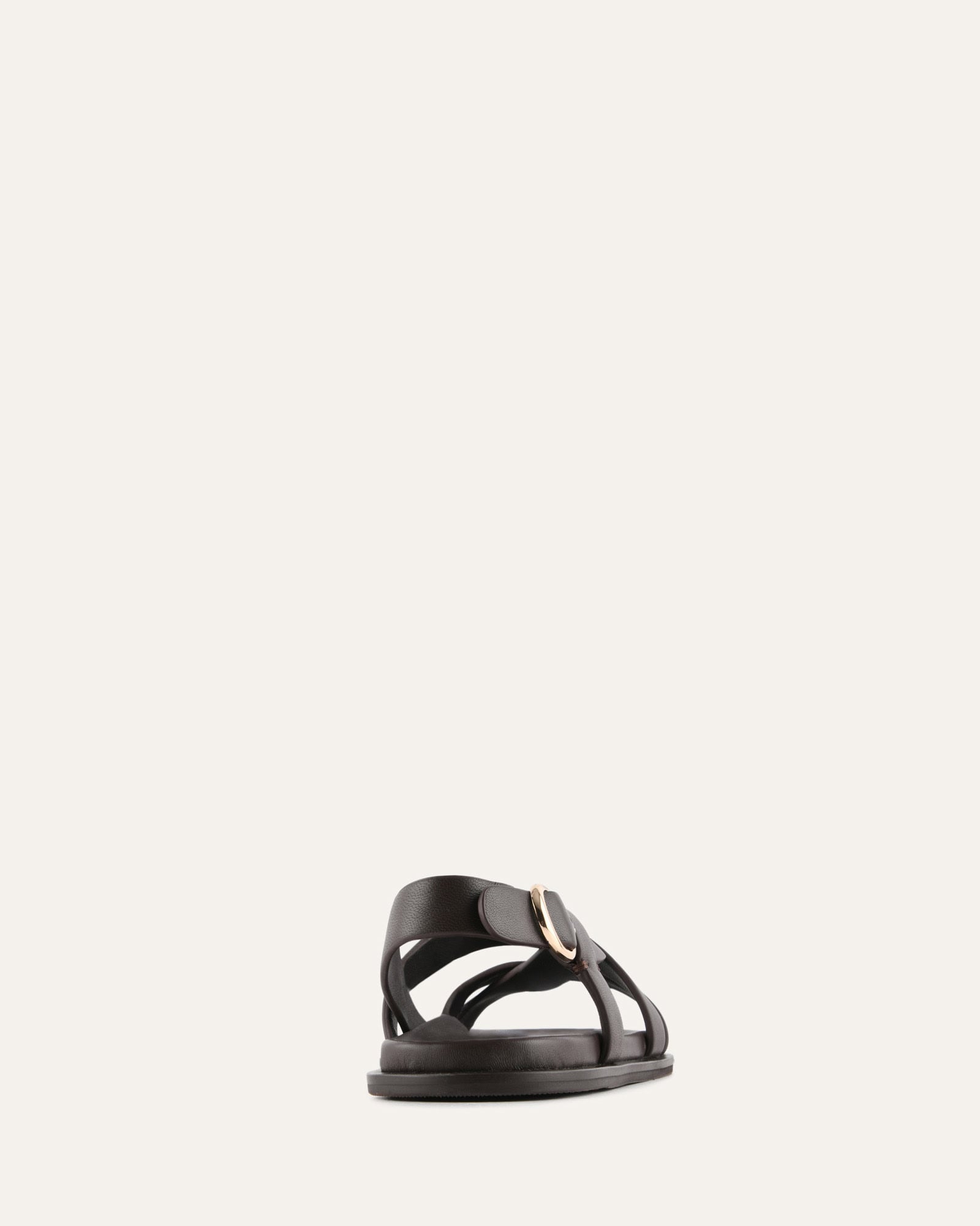 FALCON is a refined flat sandal crafted from kid leather, featuring a fully wrapped padded insole with edge stitch detailing for elevated comfort. Designed with a square toe, adjustable ankle strap, and soft gold hardware, it’s a versatile staple for effortless day to night wear.