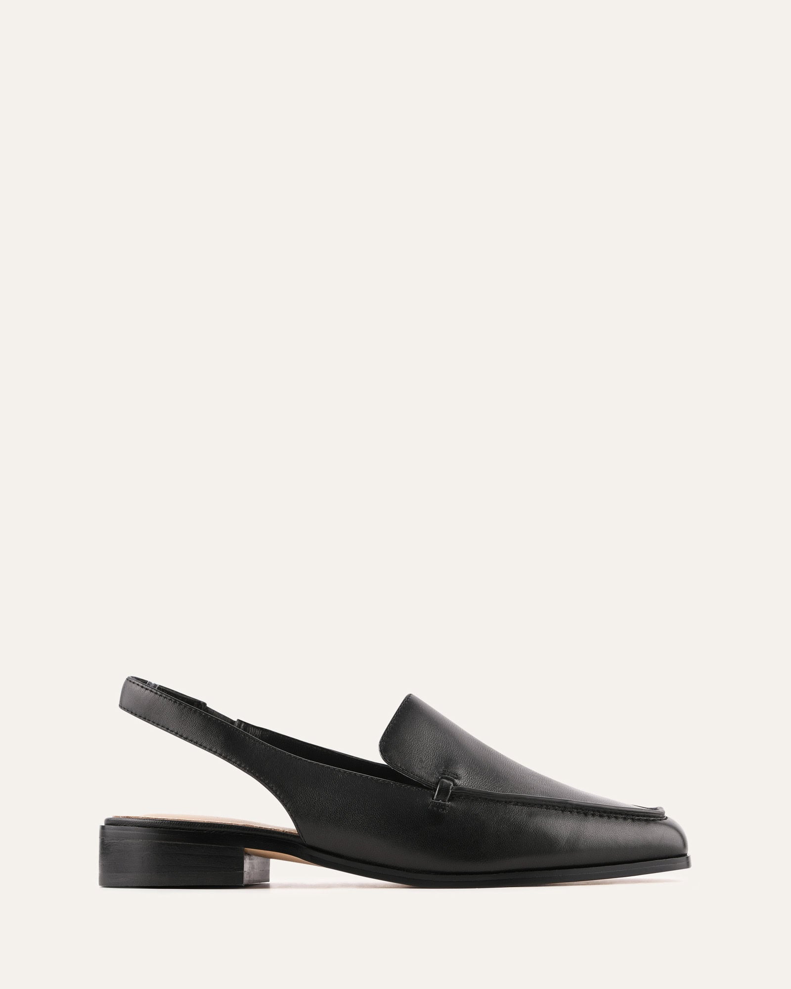 RANA is a modern slingback loafer designed with a sharp, structured profile. Featuring a chiselled toe and an open back with a slingback strap, this style delivers a refined take on a classic loafer silhouette. Finished with a leather veneer stack heel, RANA offers a sleek, contemporary look with subtle elevation.