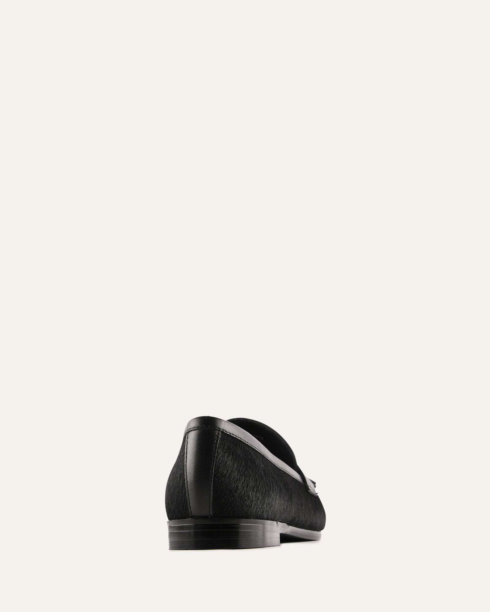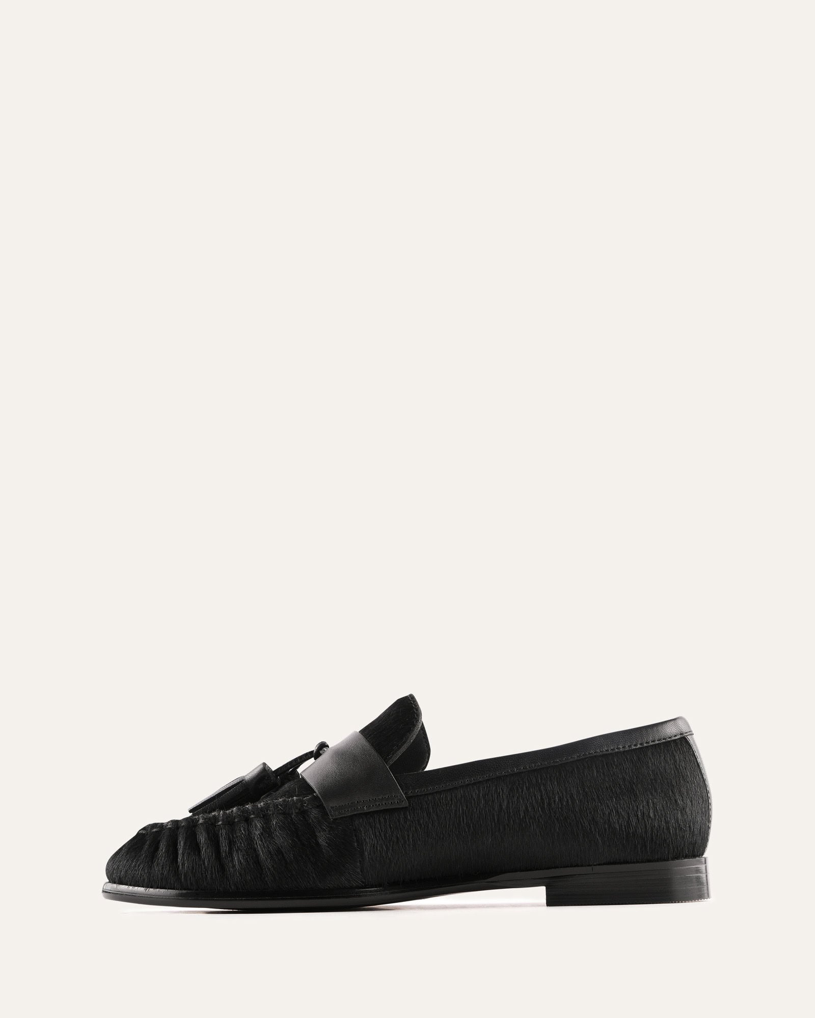 MYRA is a classic penny loafer designed with refined detailing and a structured silhouette. Featuring gathered detailing around the toe and a vamp strap with tassel accents, this style delivers a polished, heritage-inspired look. Finished in hair-on cow leather and set on a leather veneer stack heel, MYRA offers a distinctive take on a timeless loafer.