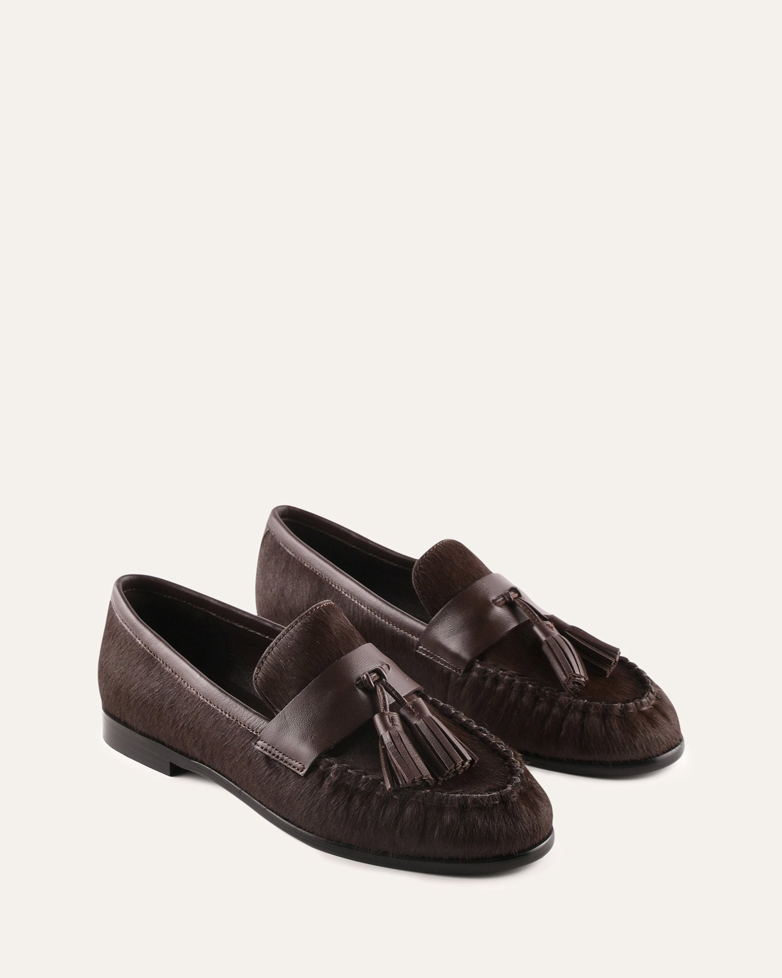 MYRA is a classic penny loafer designed with refined detailing and a structured silhouette. Featuring gathered detailing around the toe and a vamp strap with tassel accents, this style delivers a polished, heritage-inspired look. Finished in hair-on cow leather and set on a leather veneer stack heel, MYRA offers a distinctive take on a timeless loafer.
