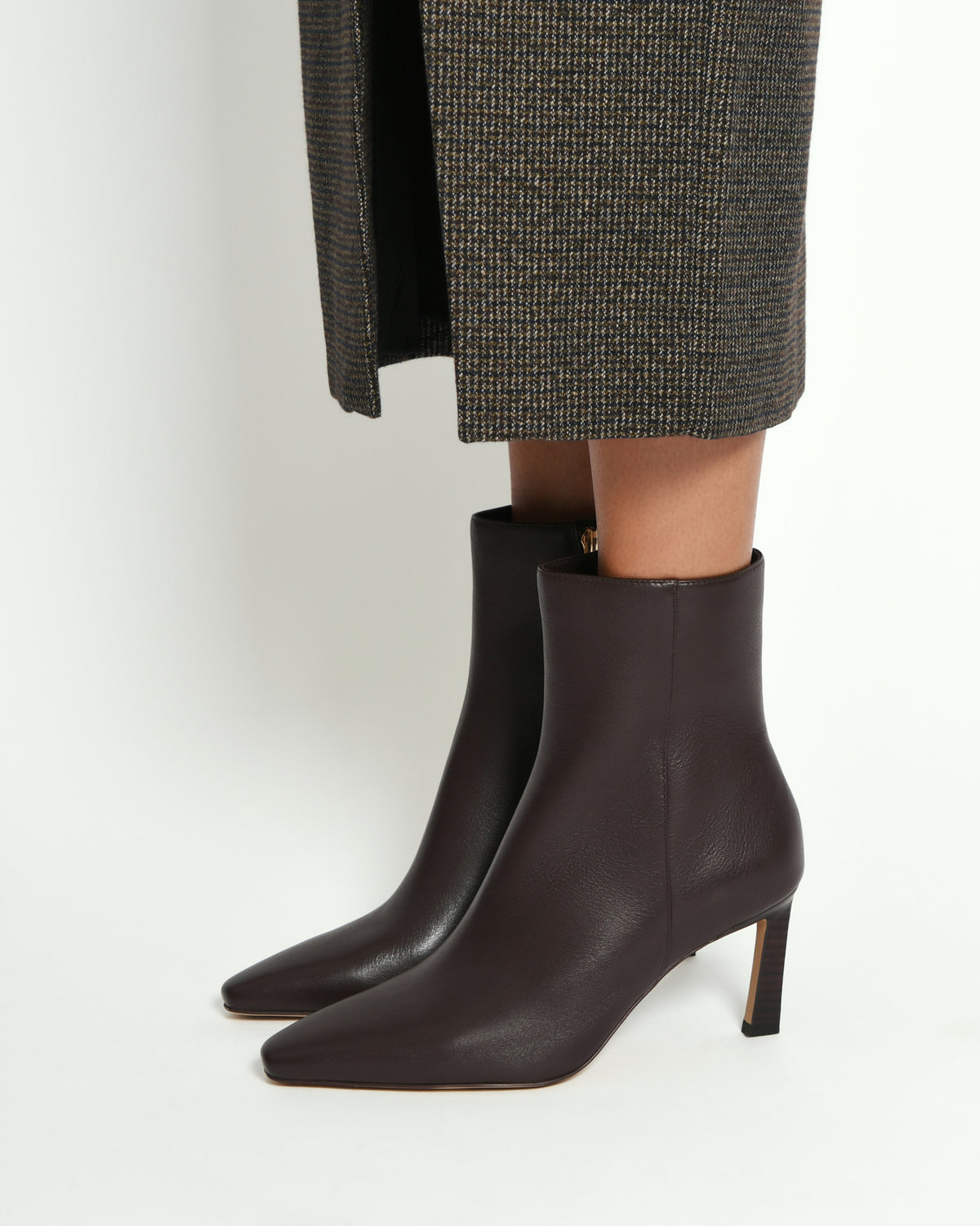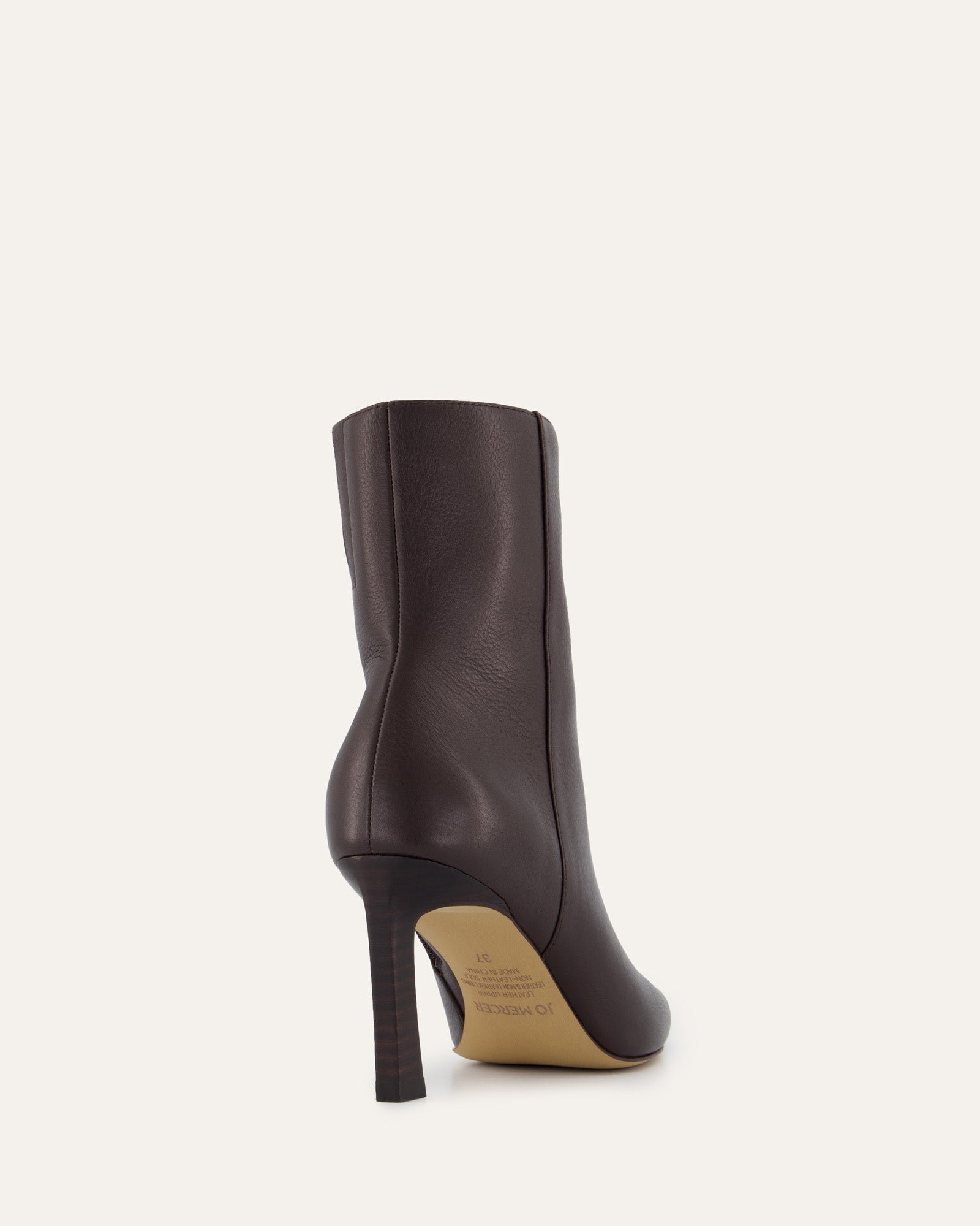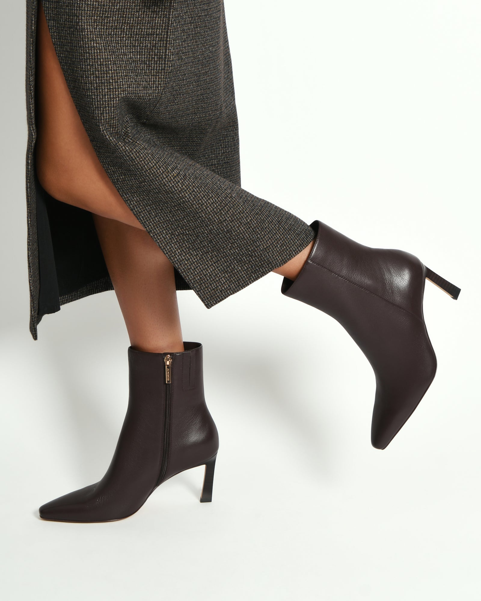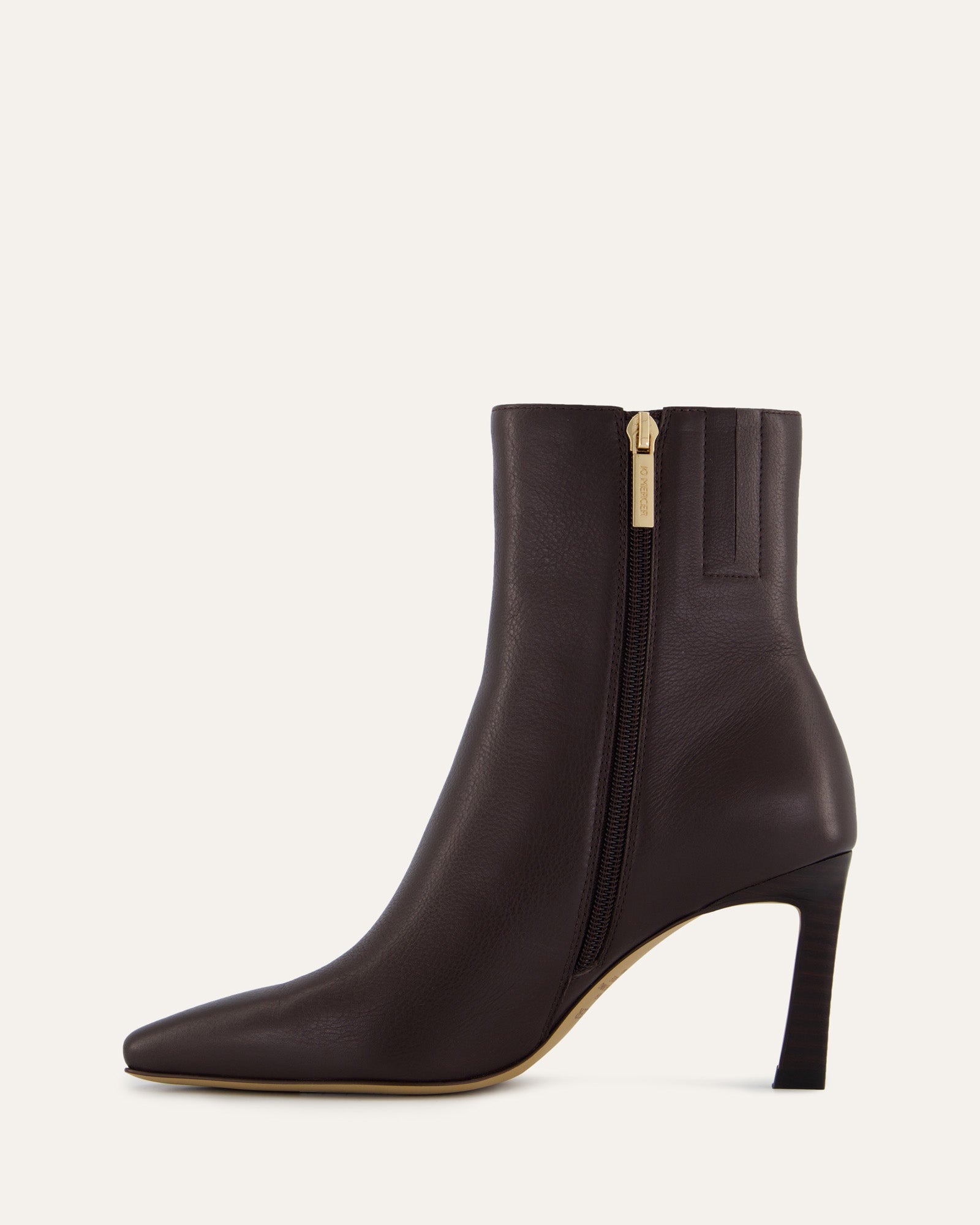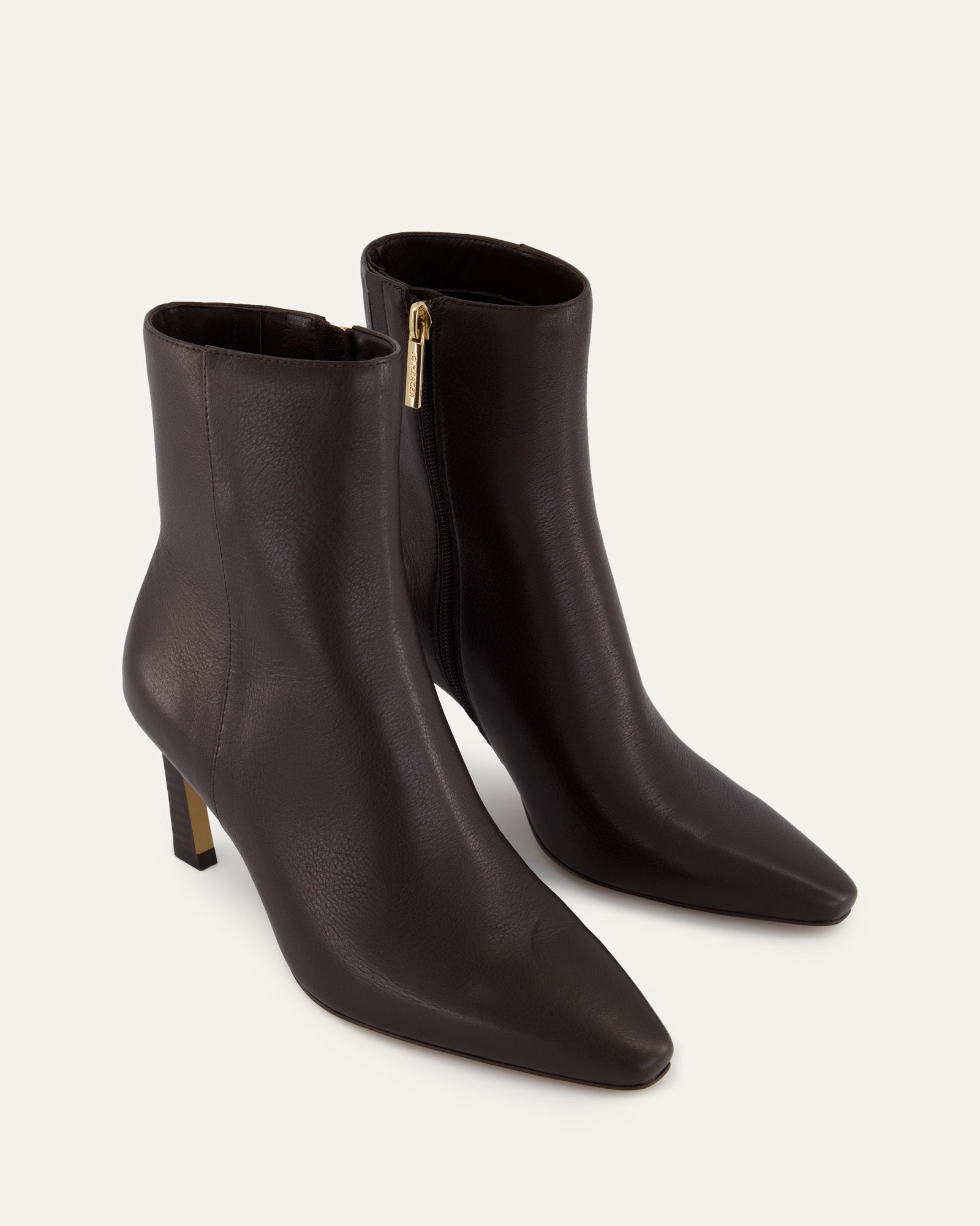 NESSIE features a chiselled toe shape and an elegant angular heel, offering a bold, architectural silhouette. Crafted from soft tumbled cow leather, it includes a convenient inside zip opening and soft gold zip puller hardware for a refined touch.