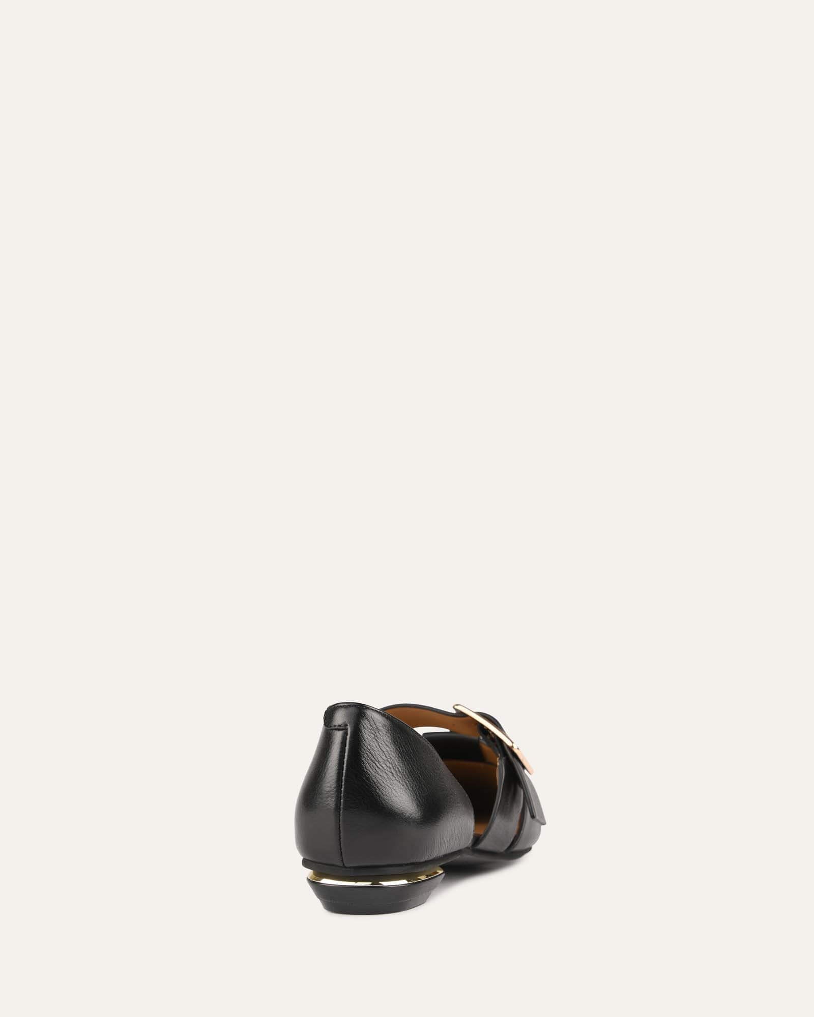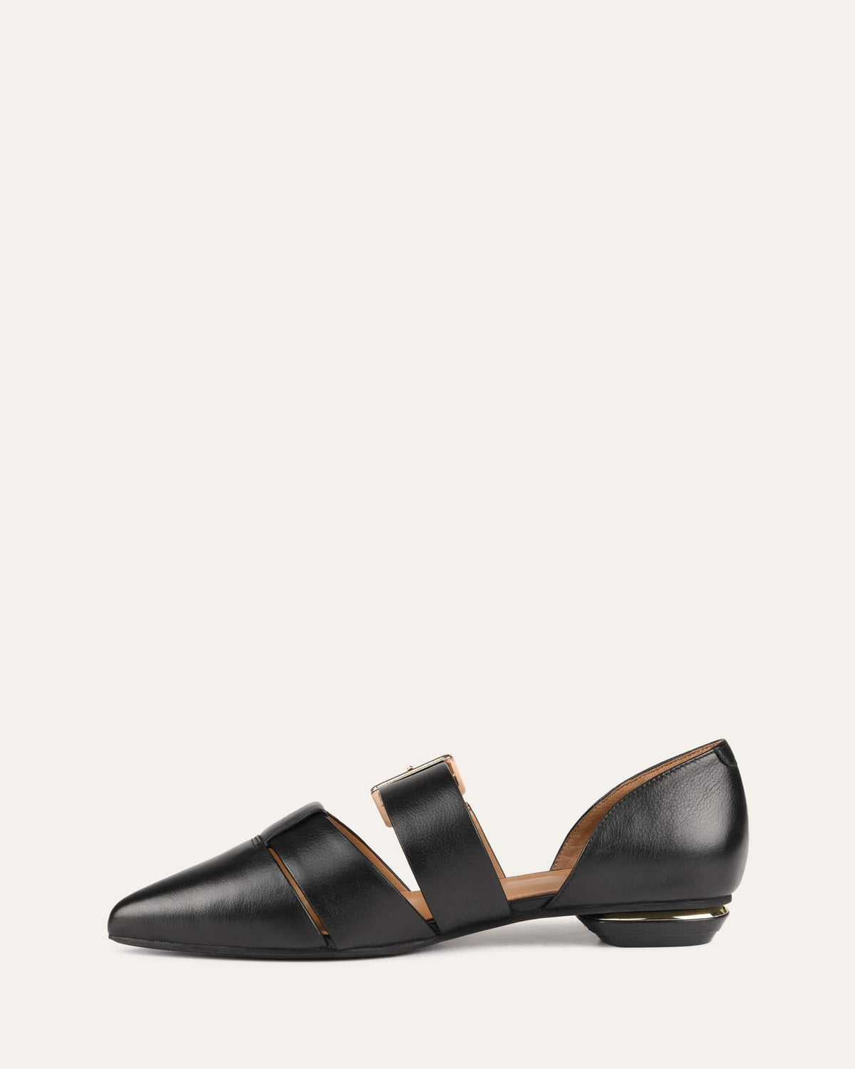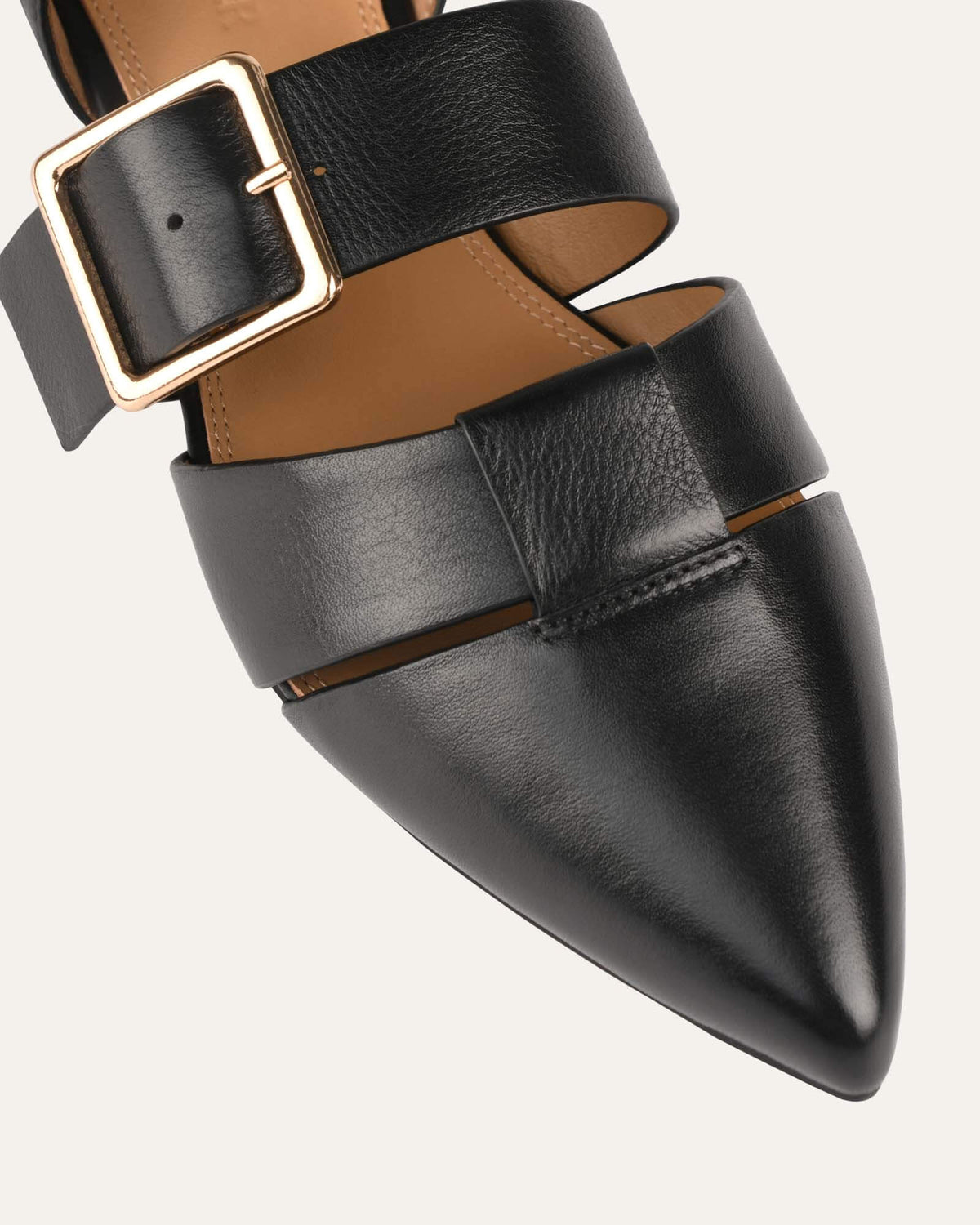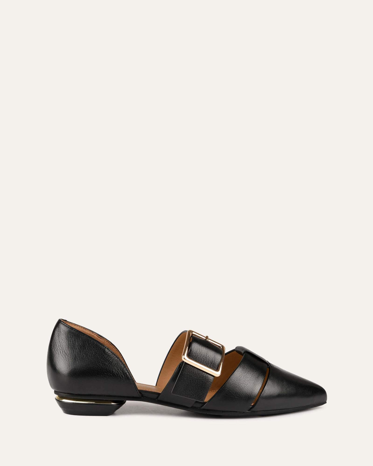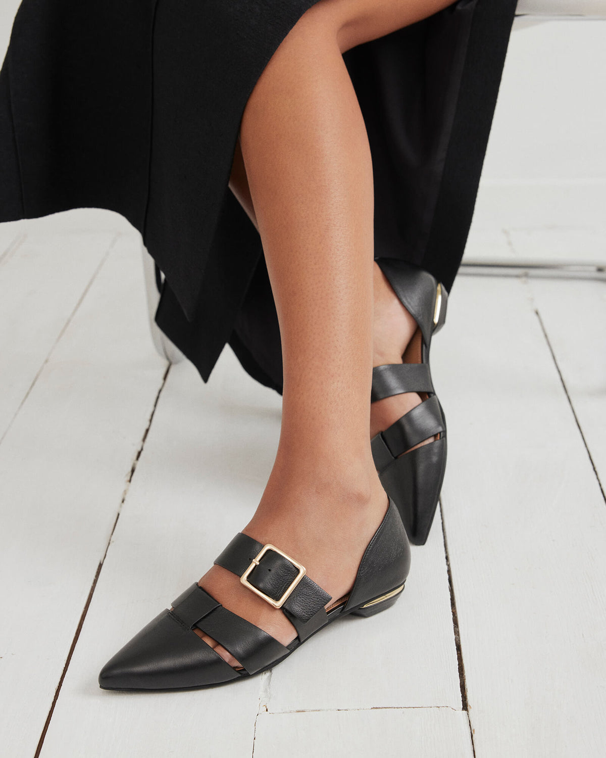 Invest in the latest Mary Jane silhouette with CARLA. Timeless and elegant, the pointed toe flat knock on heel with an upper strap supported by a metal buckle detail will take you from day to night. Style with another from tailored pants to long flowy dresses all season long.