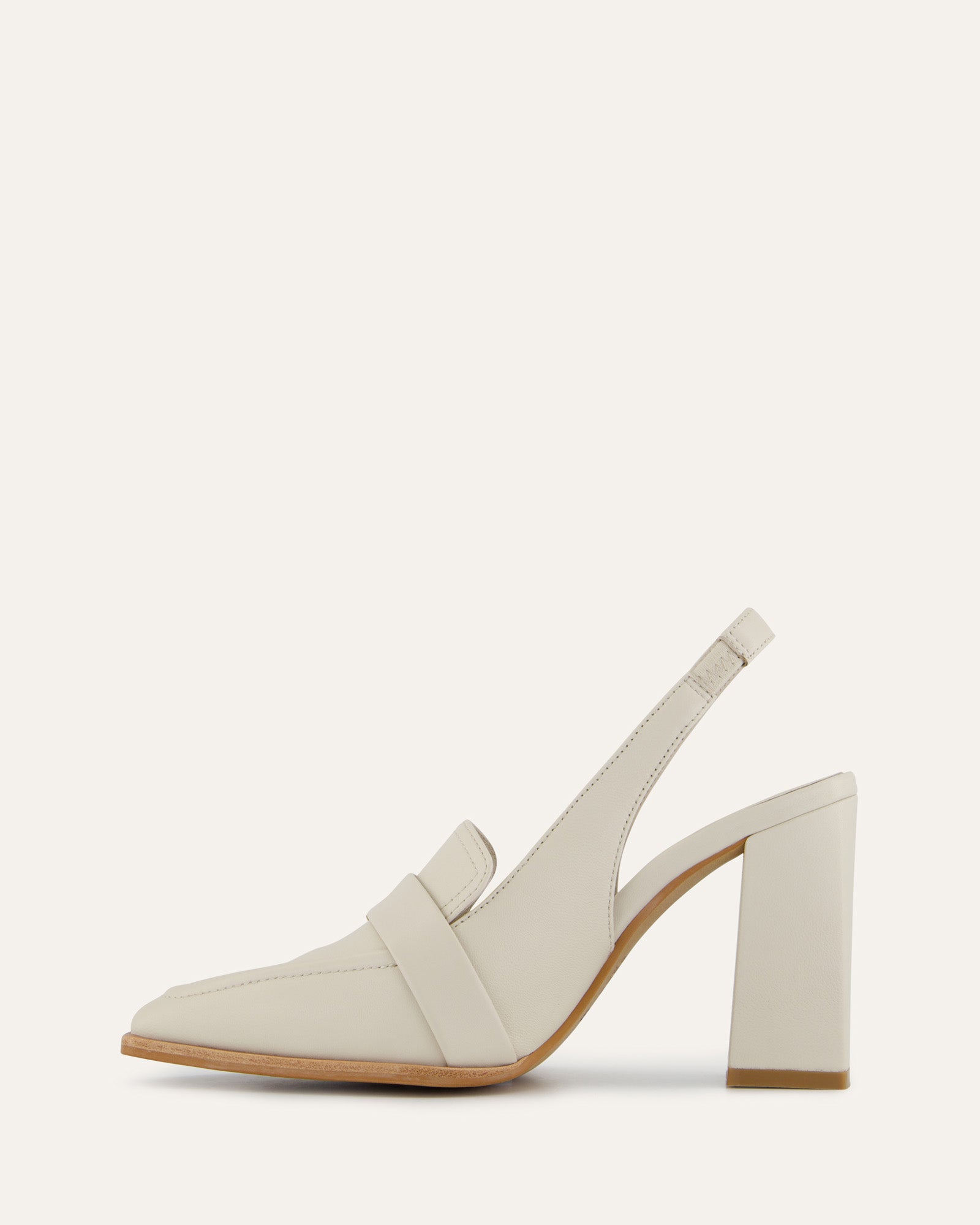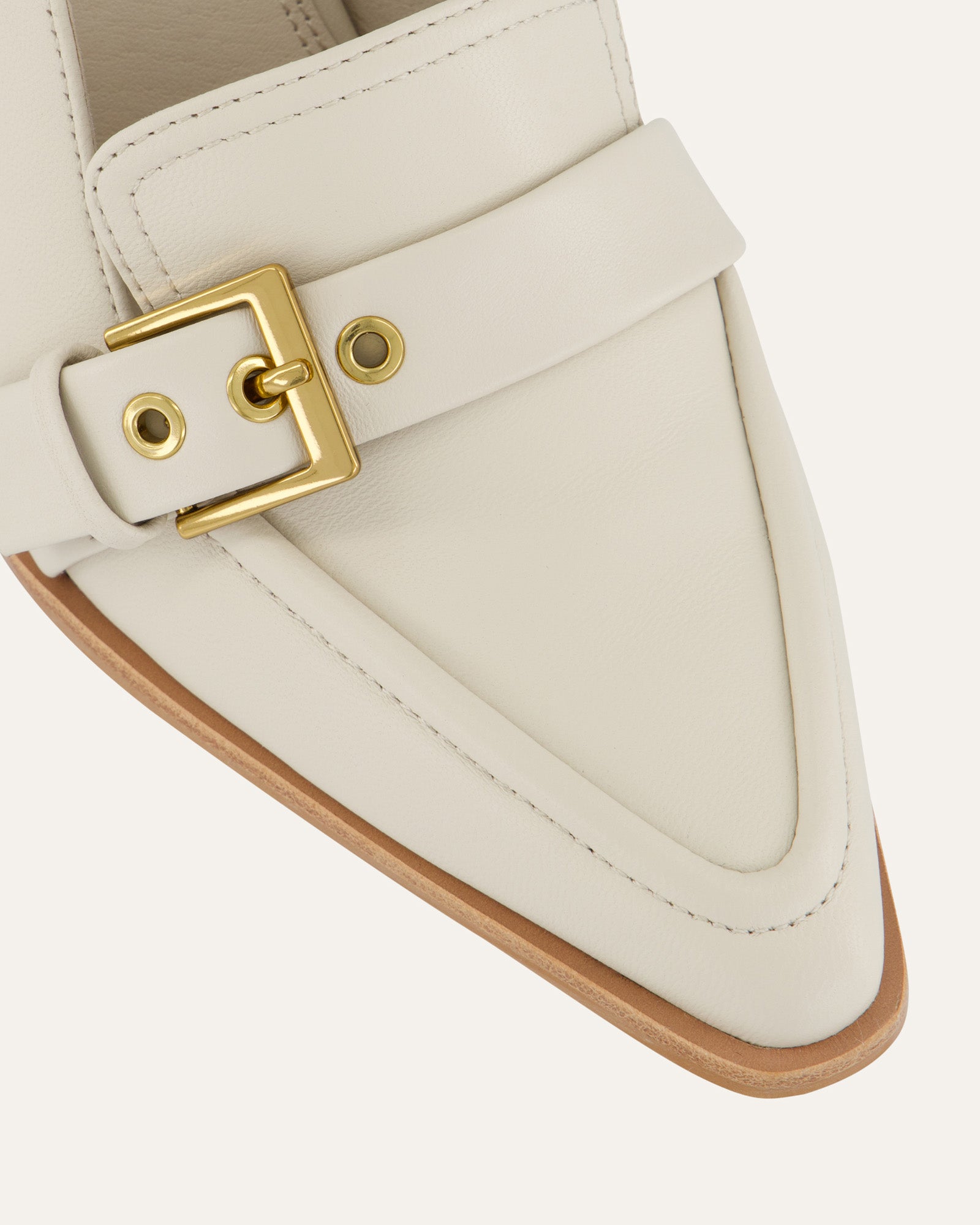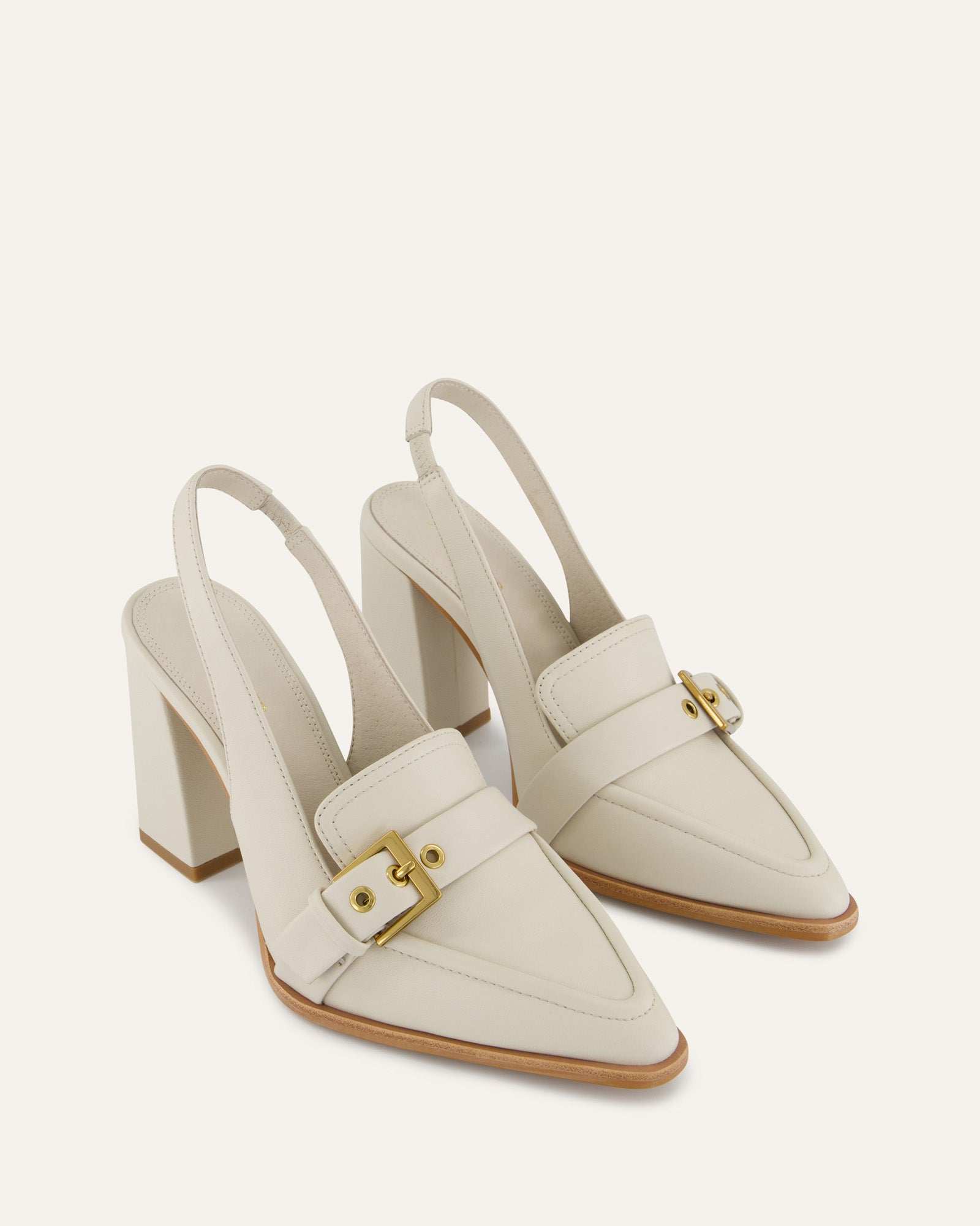 CODIE features a chic softly pointed toe and a leather-wrapped heel in rich kid leather. Accentuated by old gold hardware and a bold loafer-style heel with a buckle strap detail over the vamp, this shoe is the perfect fusion of day to night wear.