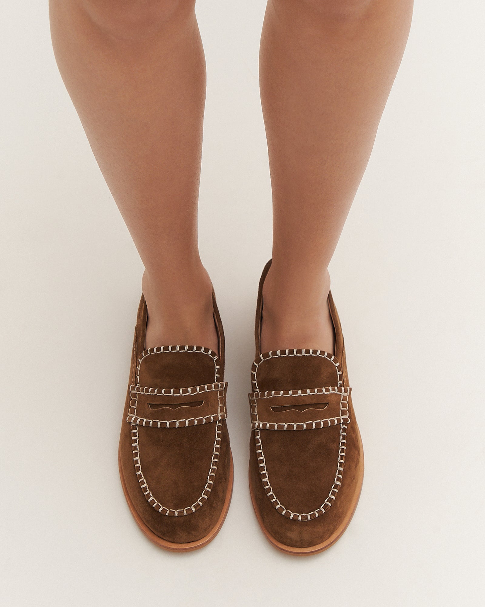 Discover ELEANOR, a modern take on a classic penny loafer design. Crafted from a kid suede, it features a rounded toe, unique contrast blanket stitching and versatile fold down back for slip on ease.