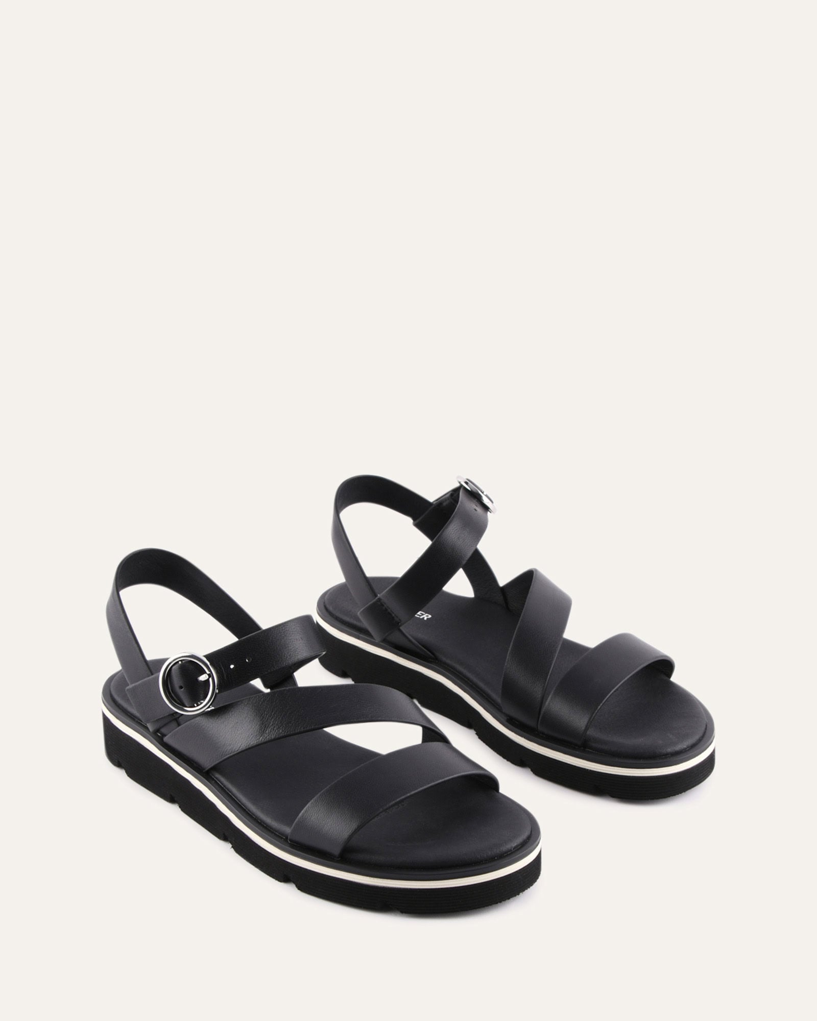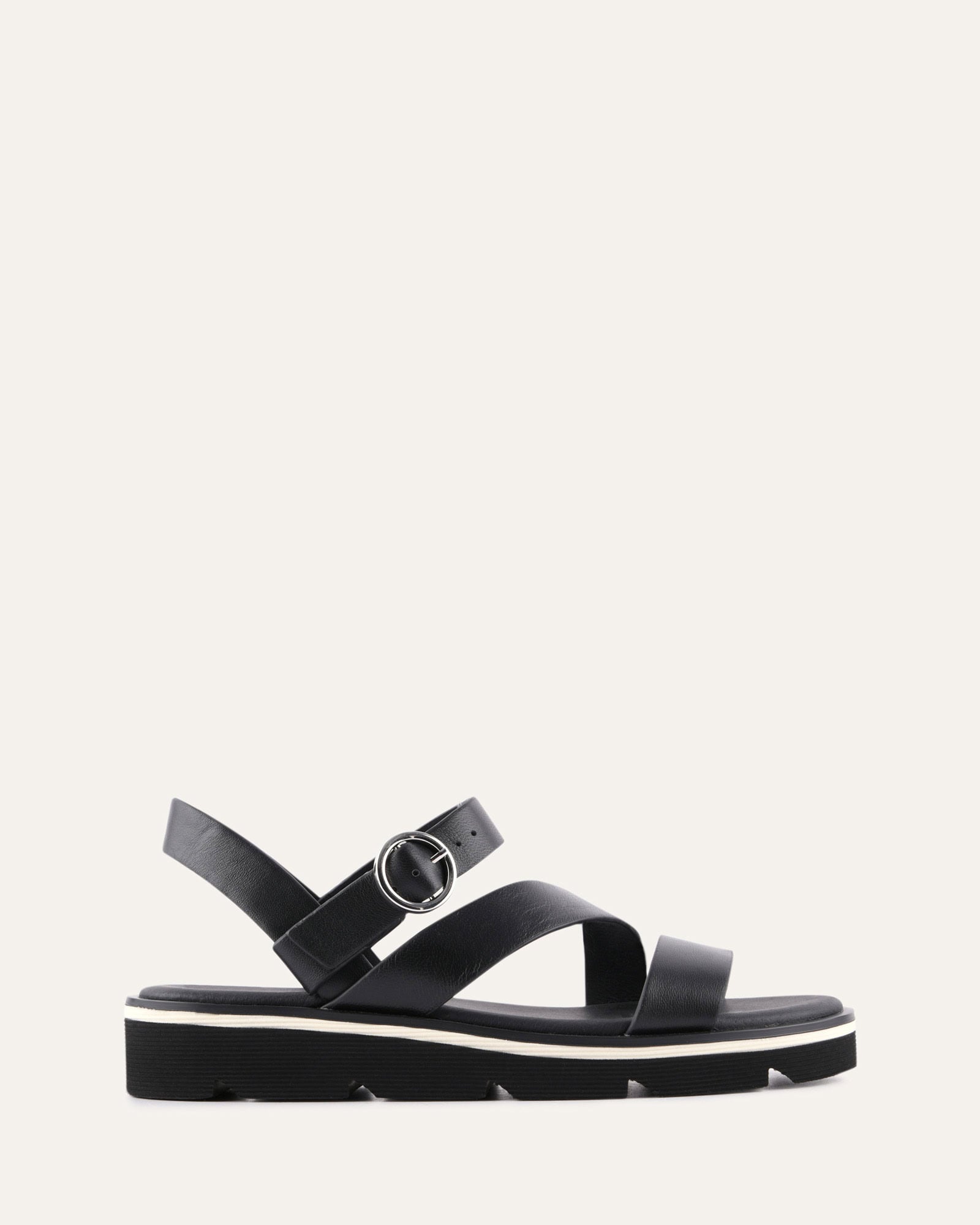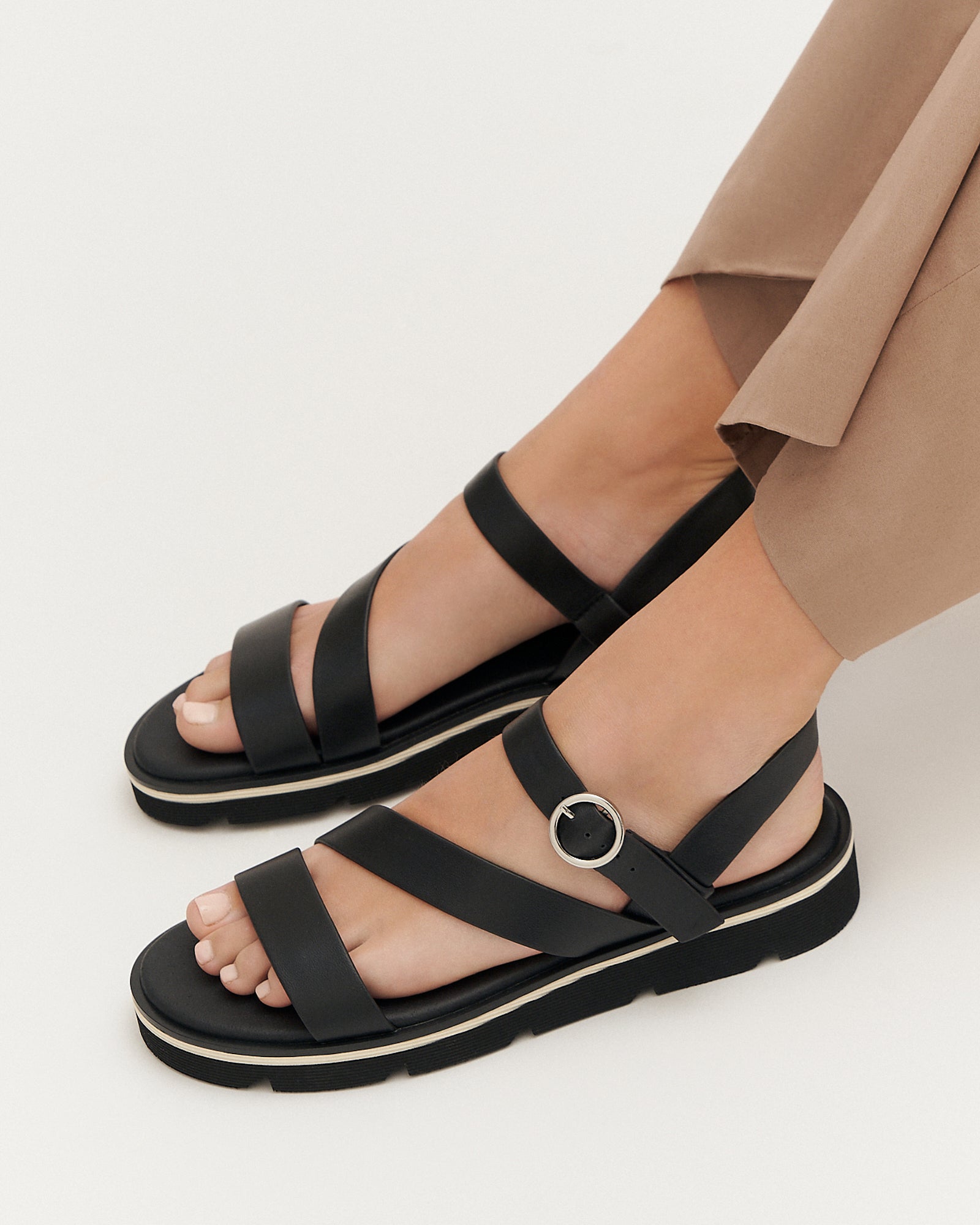 IONA blends form and function with an asymmetric kid leather upper and Y-back adjustable ankle strap. Set on a contrast black-and-white cleated EVA sole with a slight wedge, it features a rounded toe and shiny silver buckle for a contemporary finish.