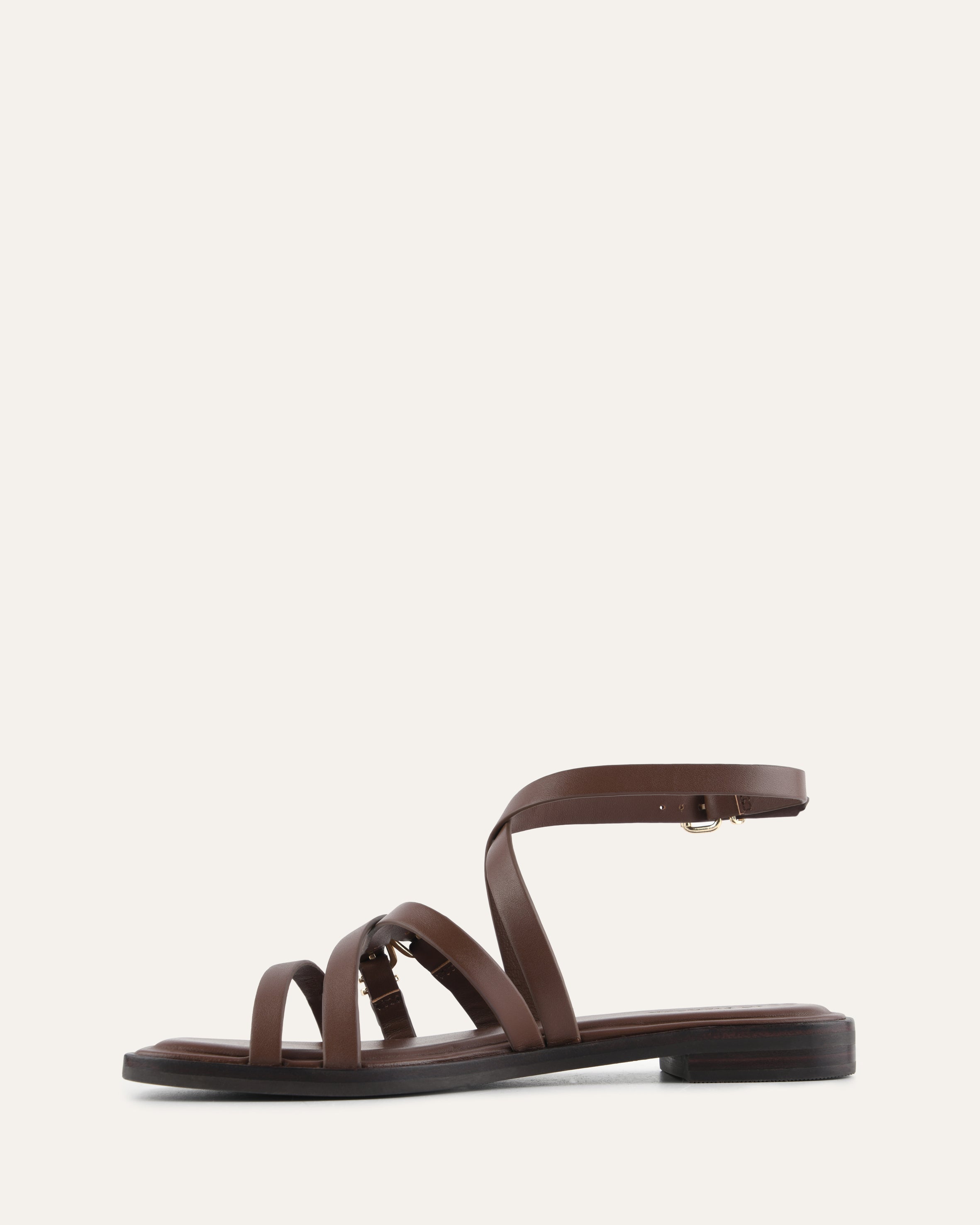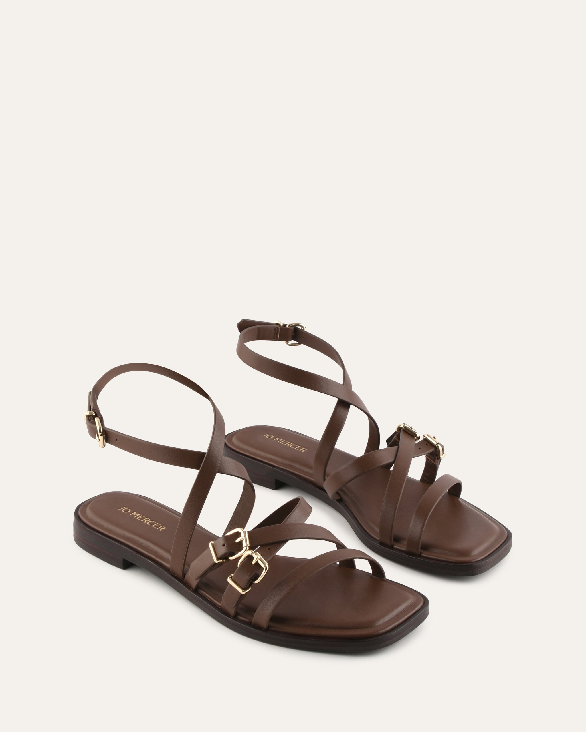 PIERRE is a refined strappy flat sandal crafted from supple cow leather. It features two adjustable instep straps and a secure ankle strap for a custom fit. Finished with soft gold hardware, a softly squared toe, and a leather veneer stack heel, it’s a versatile staple with understated polish.