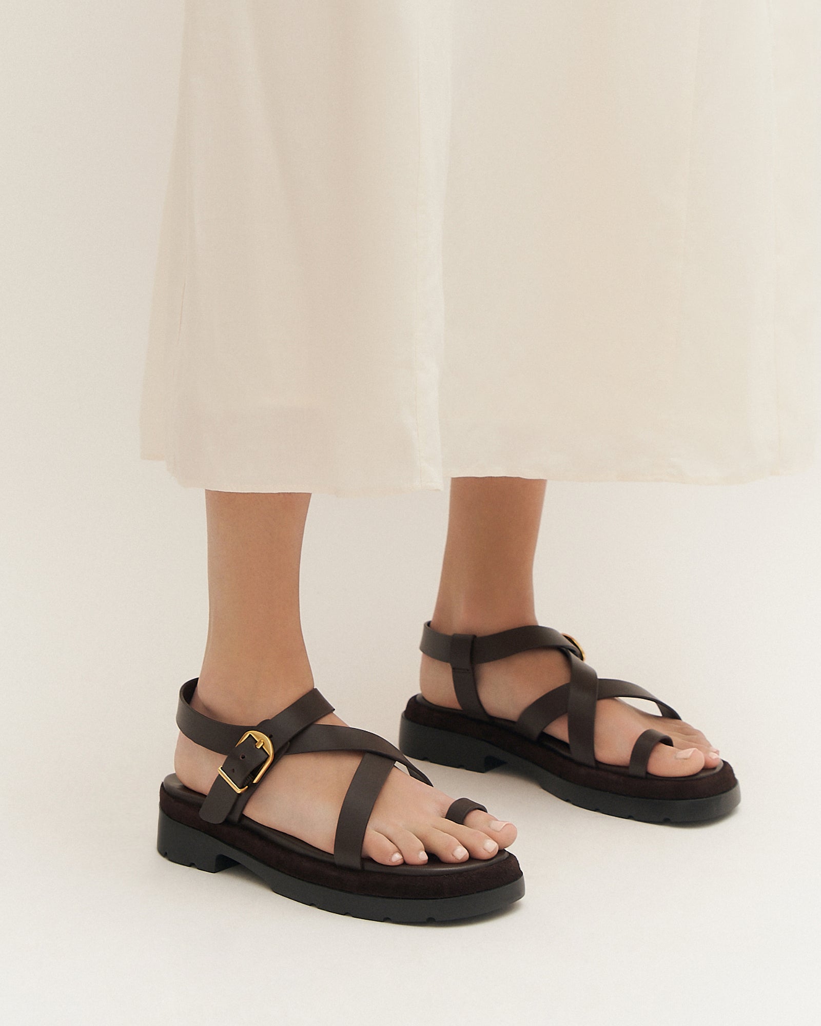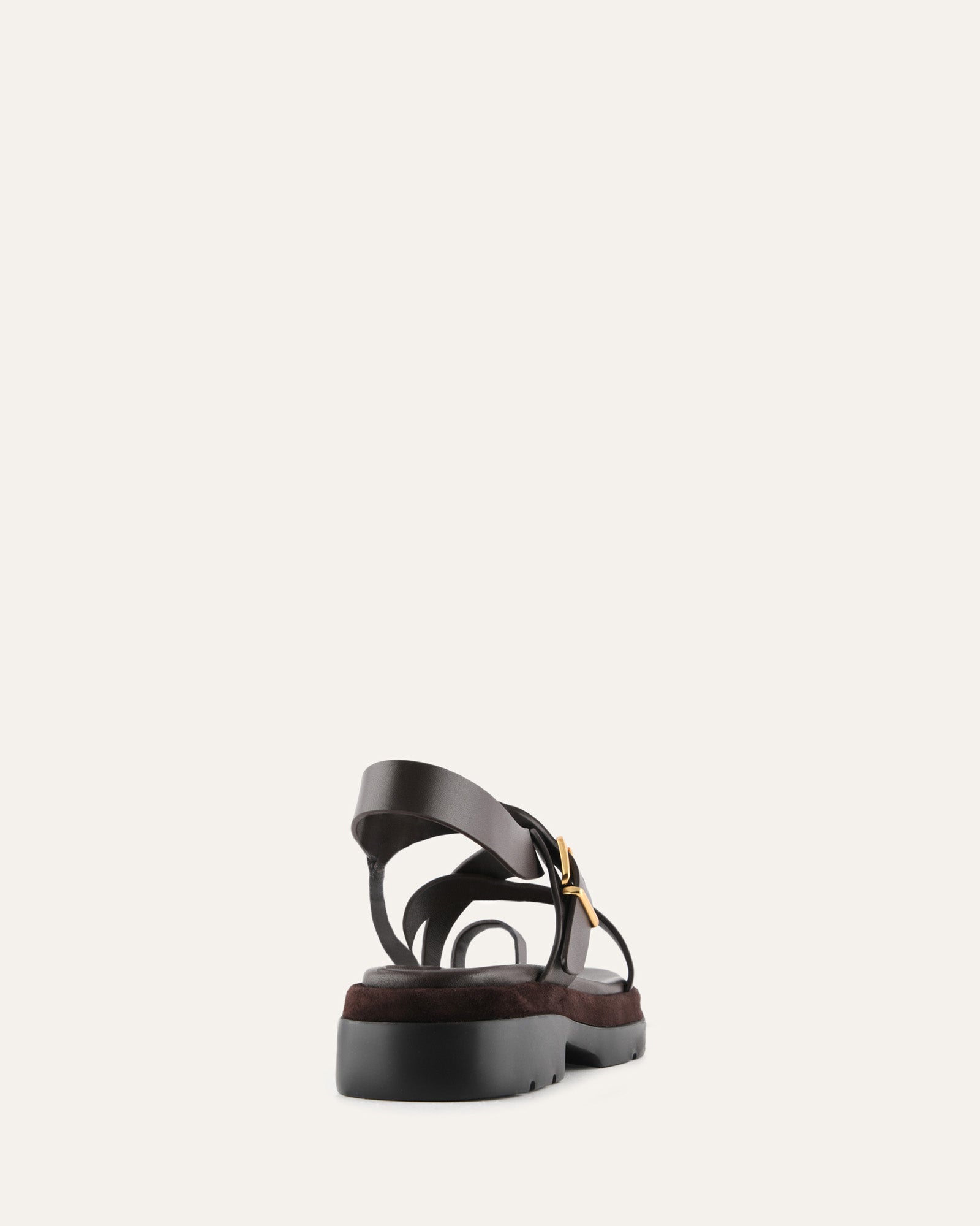 TOMMY is a flat chunky sandal crafted from smooth leather, featuring adjustable buckles and a slip on design for effortless wear. Finished with a suede wrapped midsole, cleated outsole, softly square toe and soft gold hardware.
