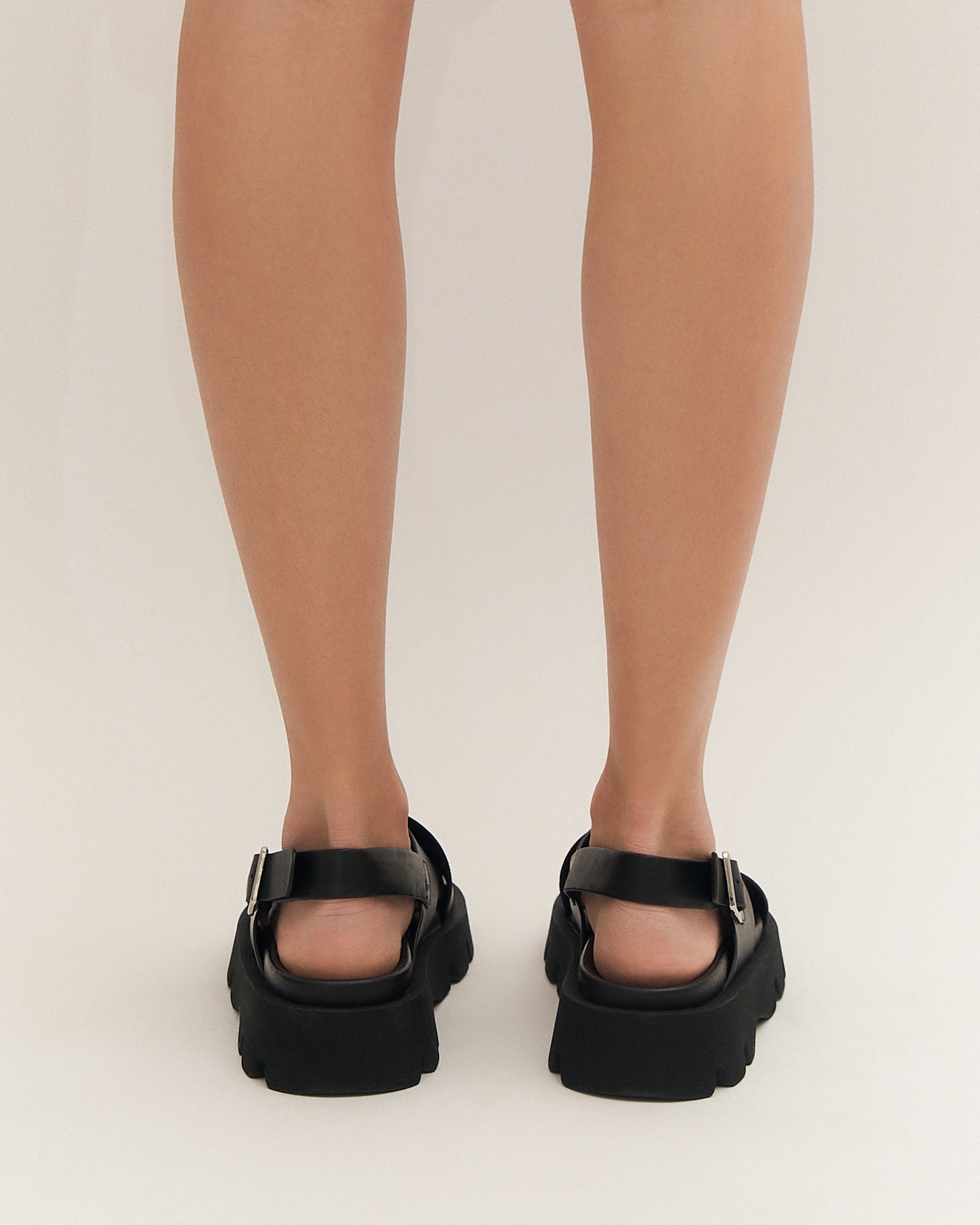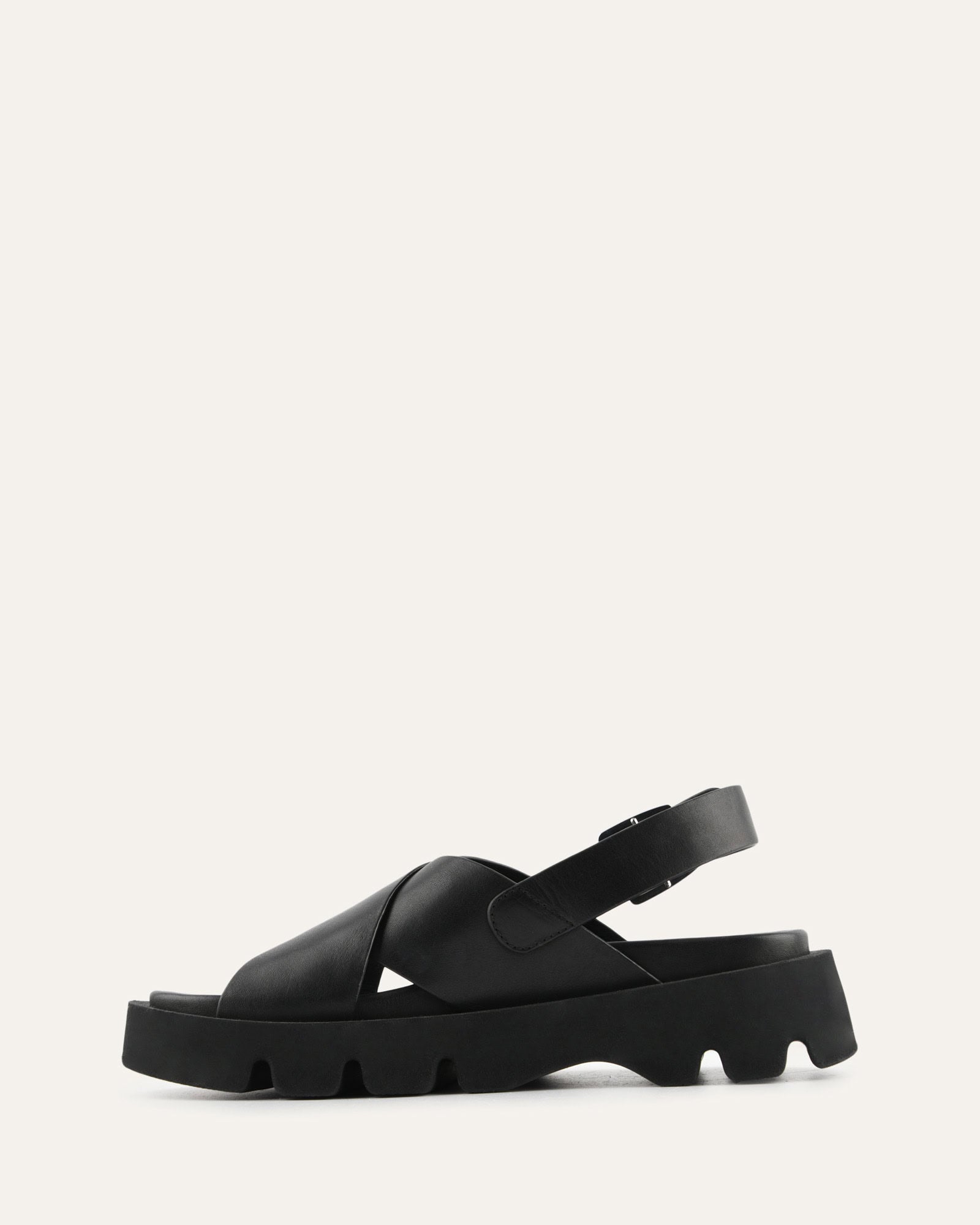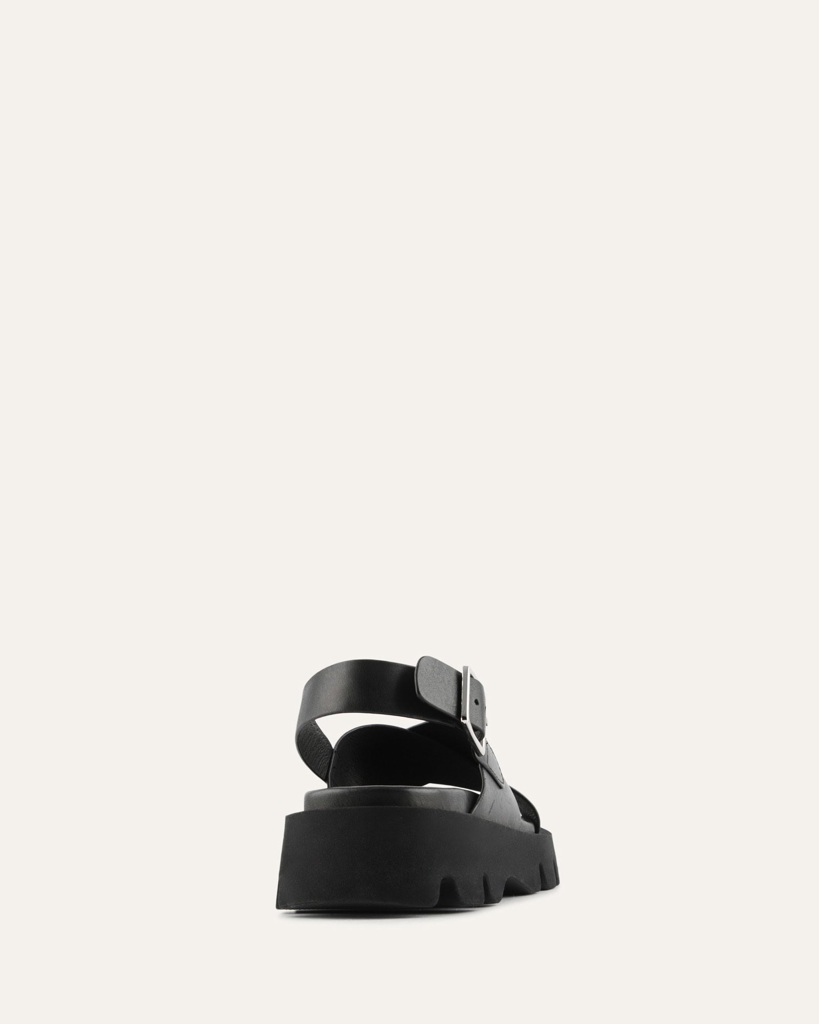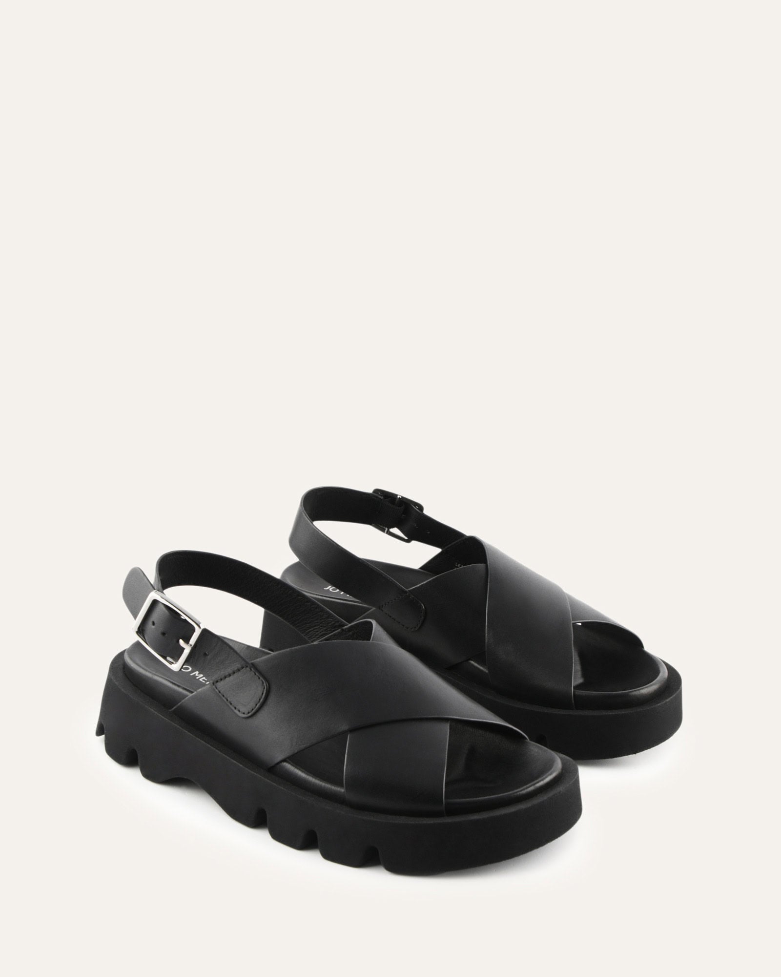 Try a new silhouette this season with JETTE. A flat chunky sandal crafted from smooth aniline calf leather, featuring a stylish crossover slingback and adjustable strap for a secure fit. Its perfect for all day wear with a flexible chunky EVA sole, softly rounded toe and sleek silver hardware.