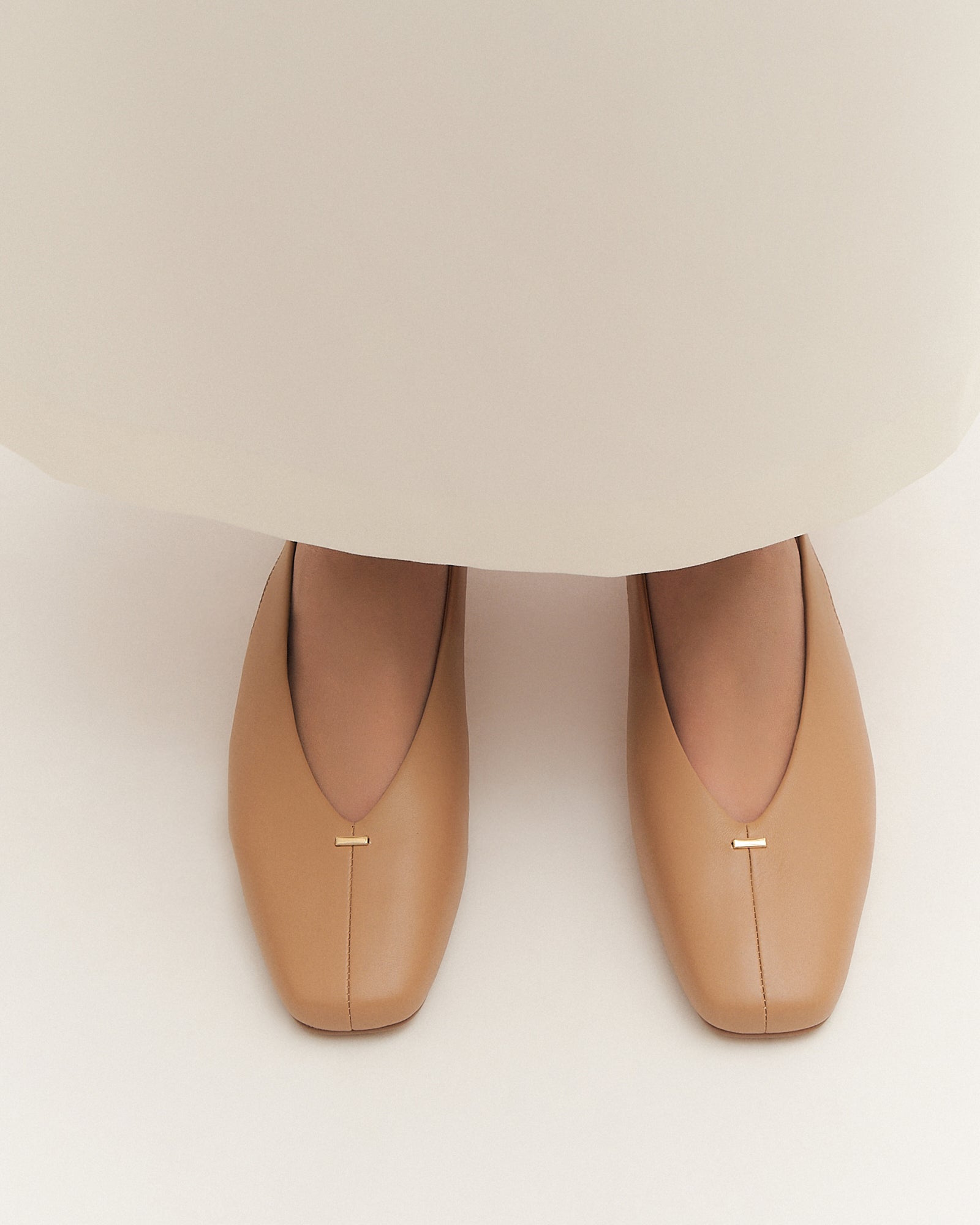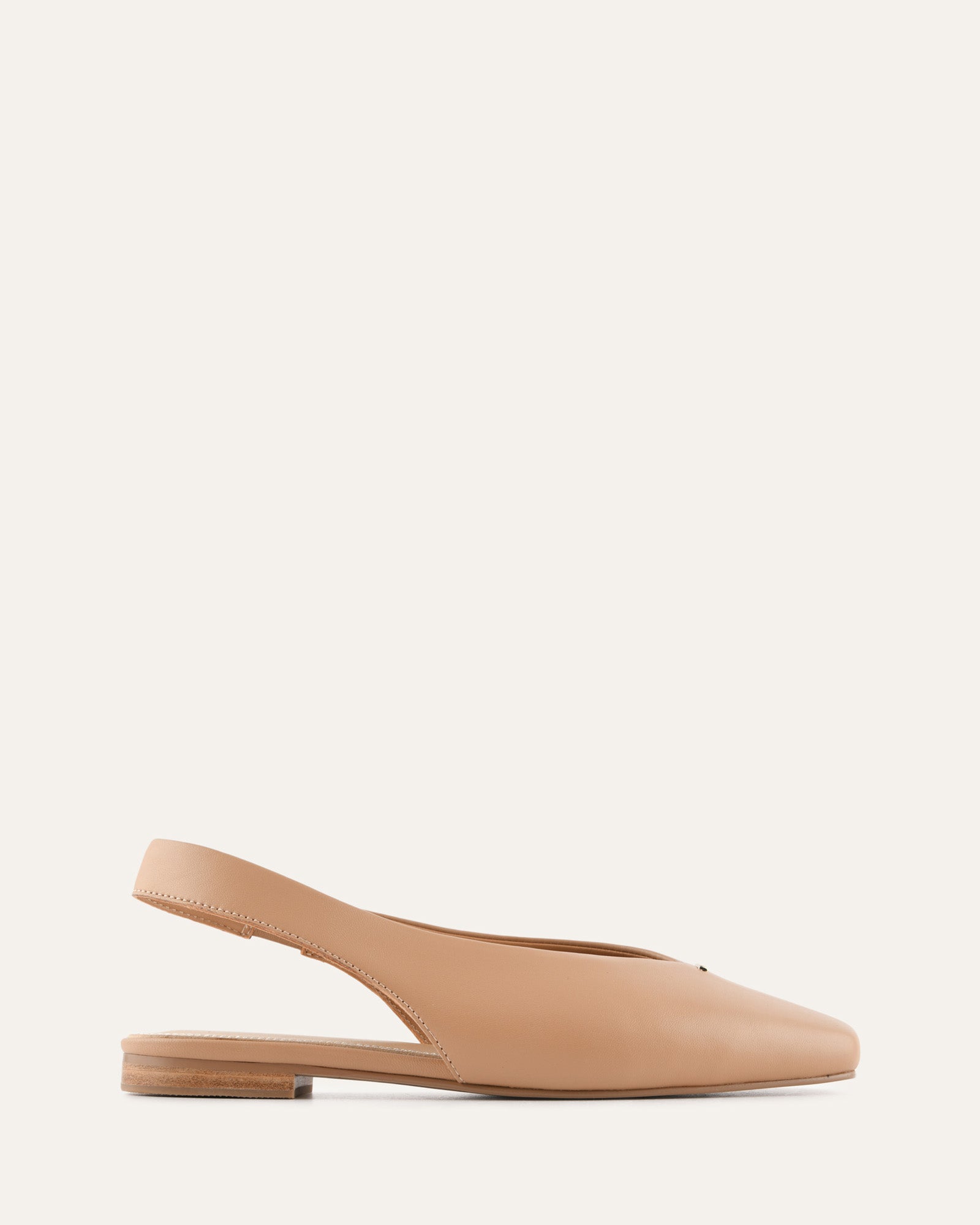 Dress up your outfit with ASHLEE. A refined flat crafted from soft kid leather, designed with a softly squared toe and an adjustable slingback strap for a secure fit. Finished with soft gold hardware and a subtle leather stack heel.