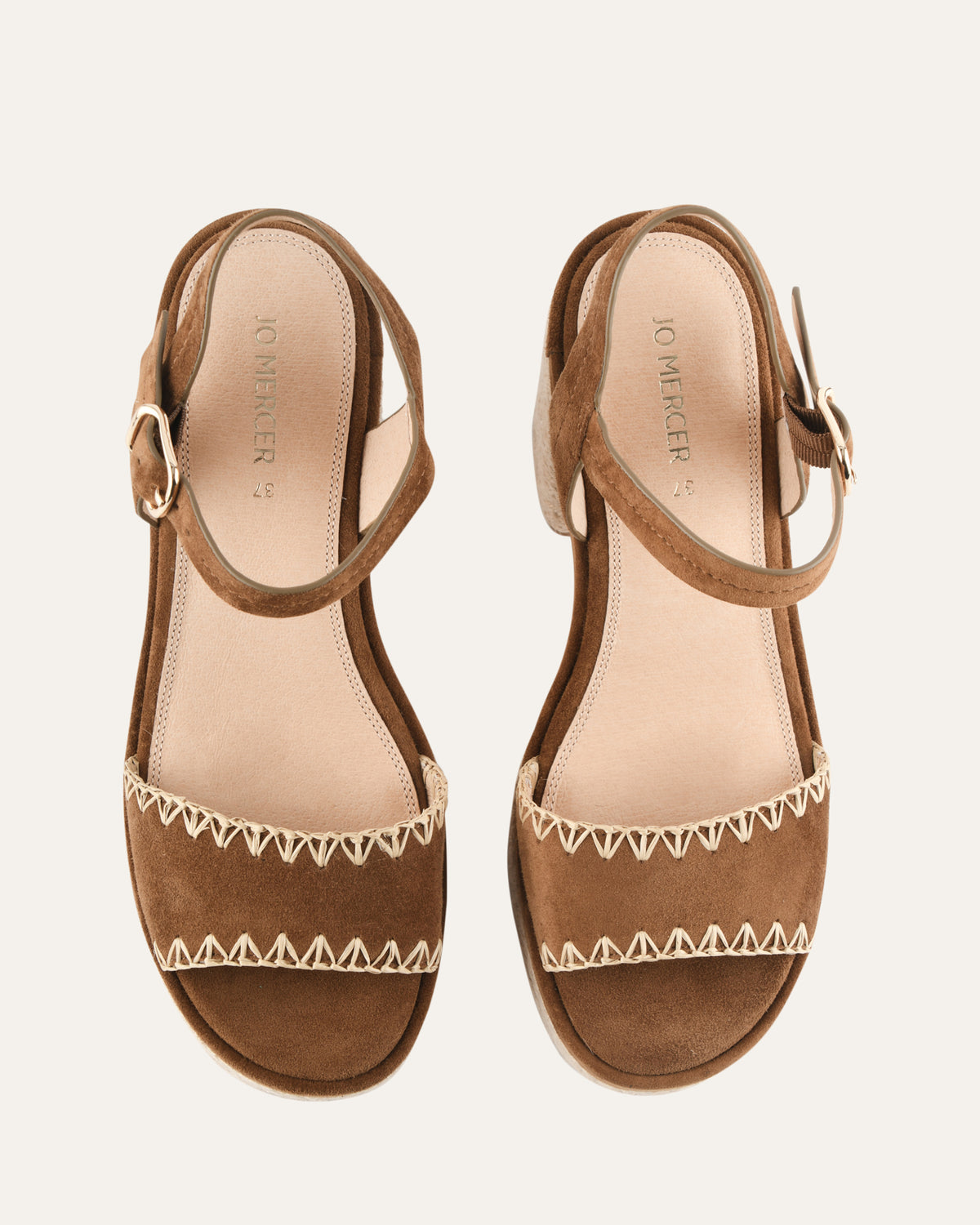 Discover the newest retro platform sandal with FISHER. Crafted from soft kid suede leather, FISHER features a braided covered heel with adjustable Y-back strap. The rounded toe shape and soft gold hardware finishes.